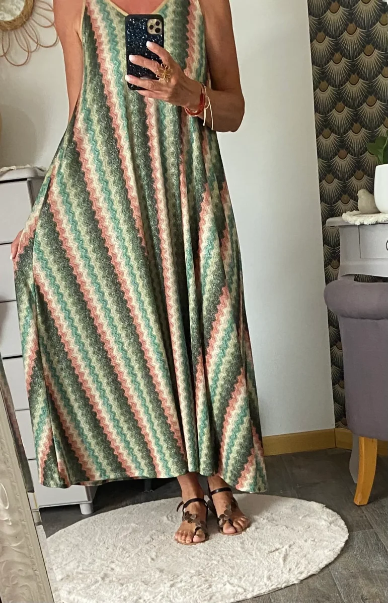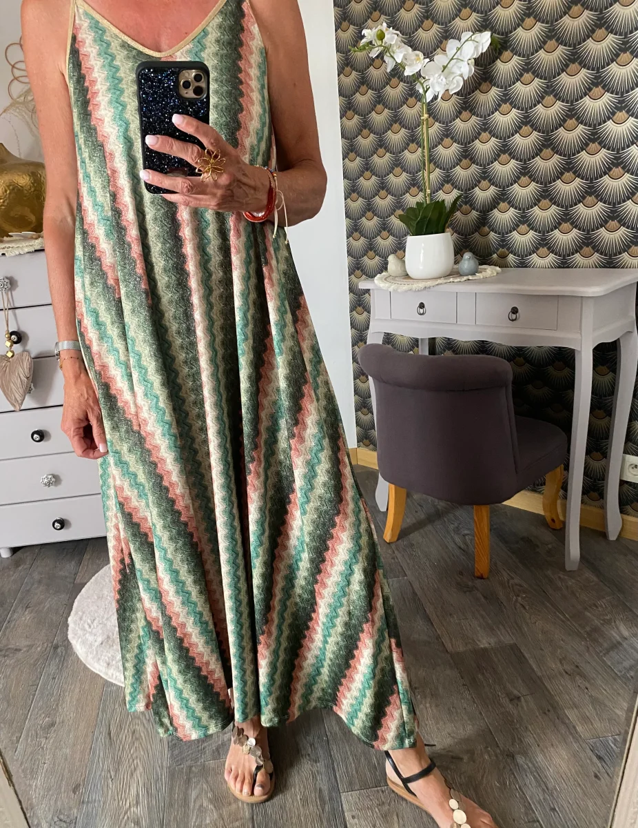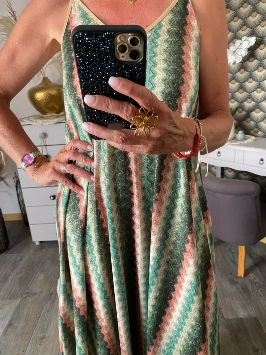 Robe longue, à bretelles fines, col v devant et derrière , en lurex , très douce sur la peau et fluide.