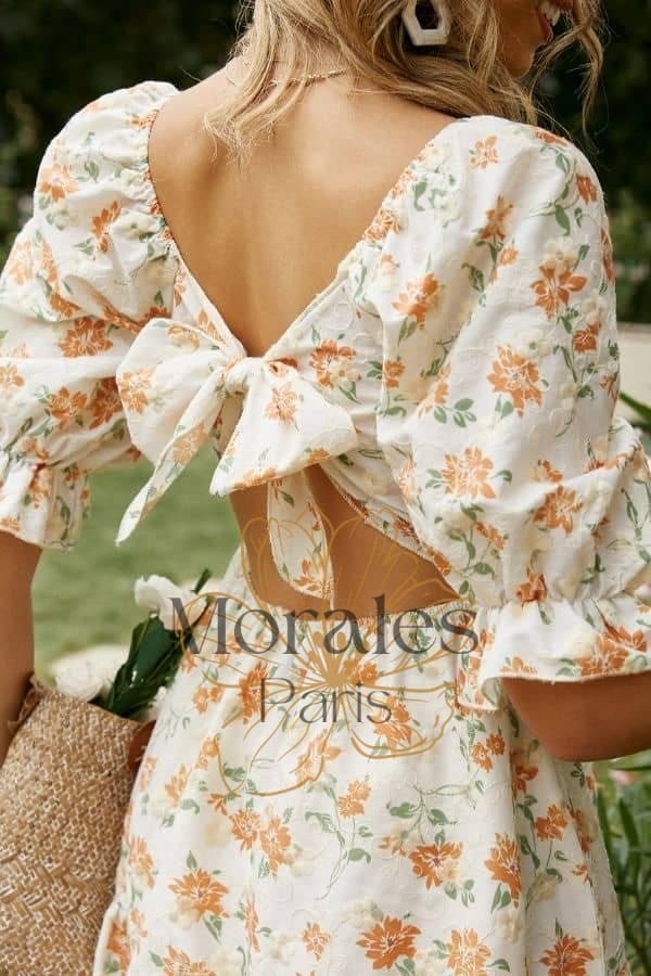 En plus, cette robe est dotée d’une encolure carrée, suivie d’un dos nu sublime. L’encolure structure le buste et le nœud au dos ajoute une touche de fraîcheur et de féminité. La coupe courte et évasée de la robe complète sa silhouette rustique.
