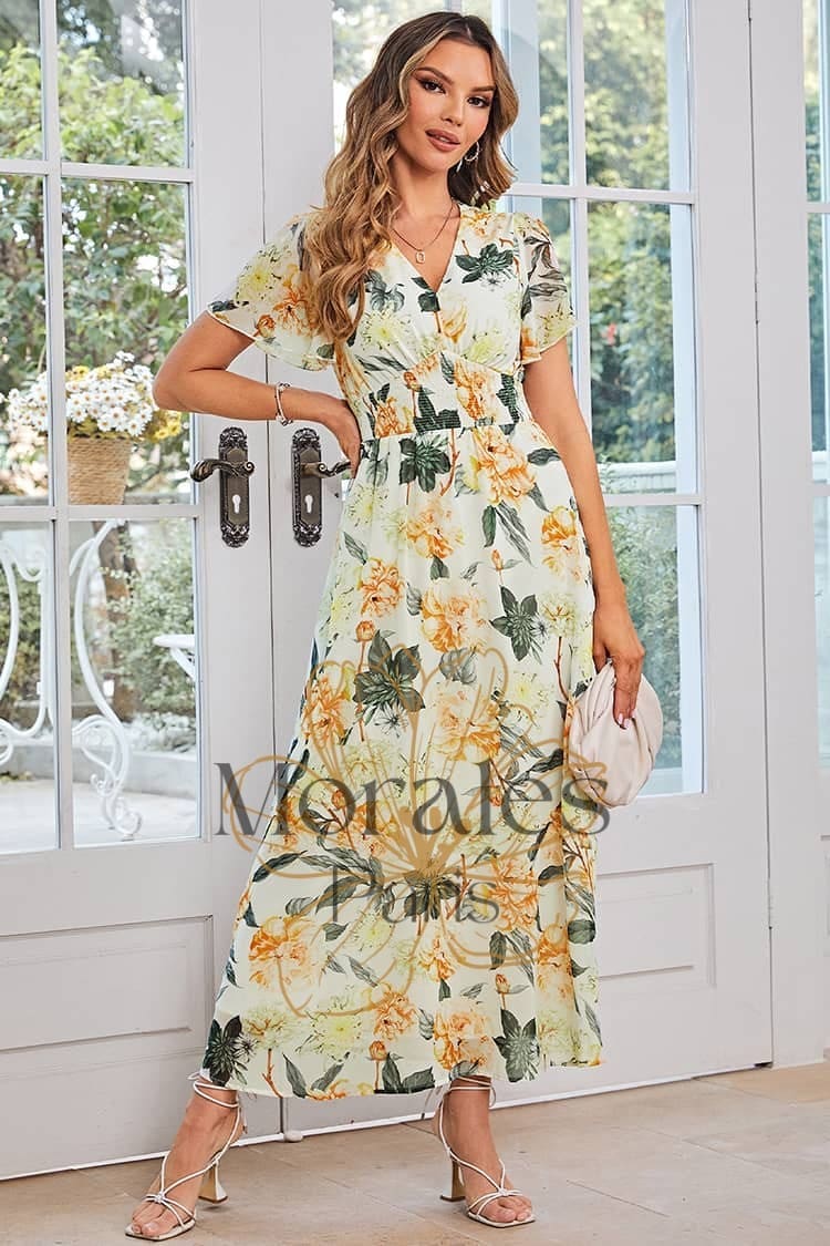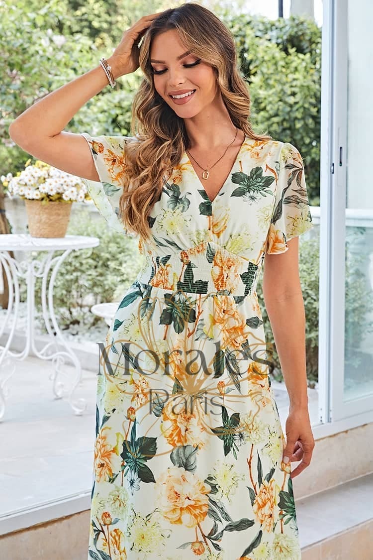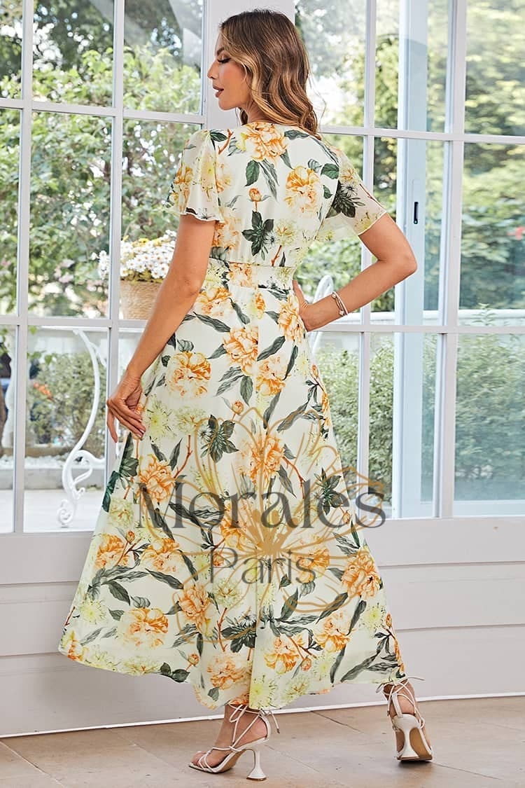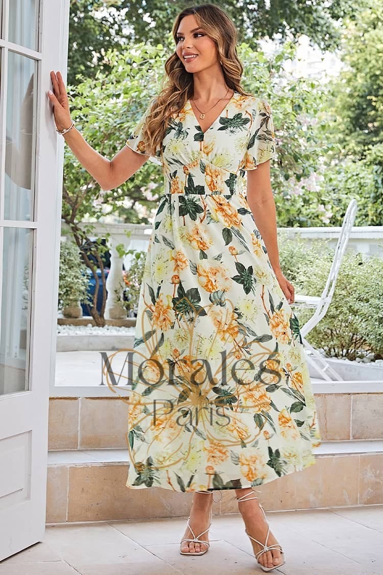 En outre, des couleurs lumineuses et des dessins floraux embellissent la pièce avec distinction. Parfaitement adaptée à un style champêtre élégant, cette robe s’accorde à merveille avec ce thème.