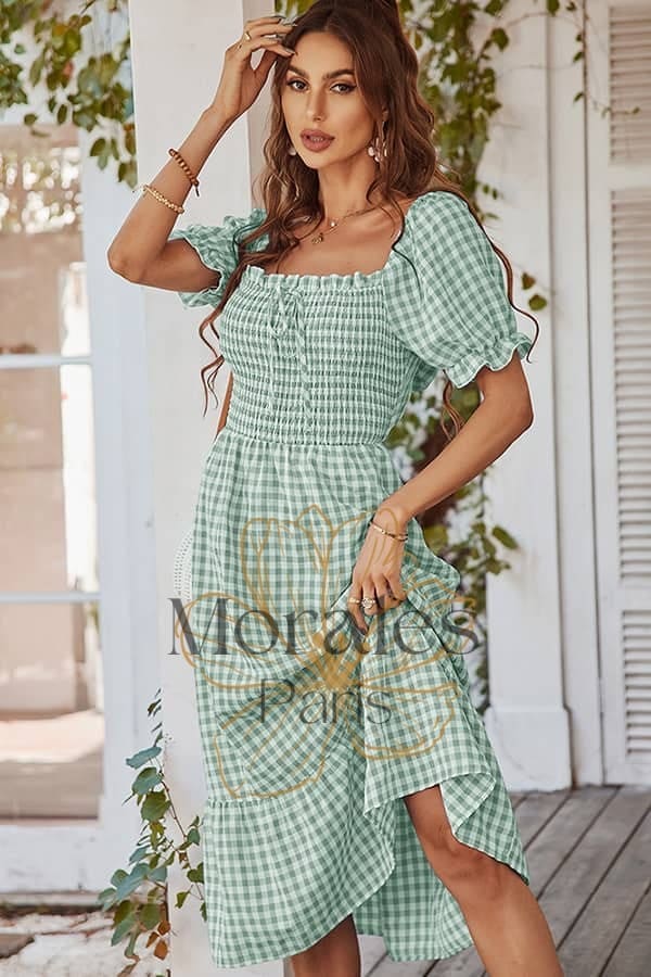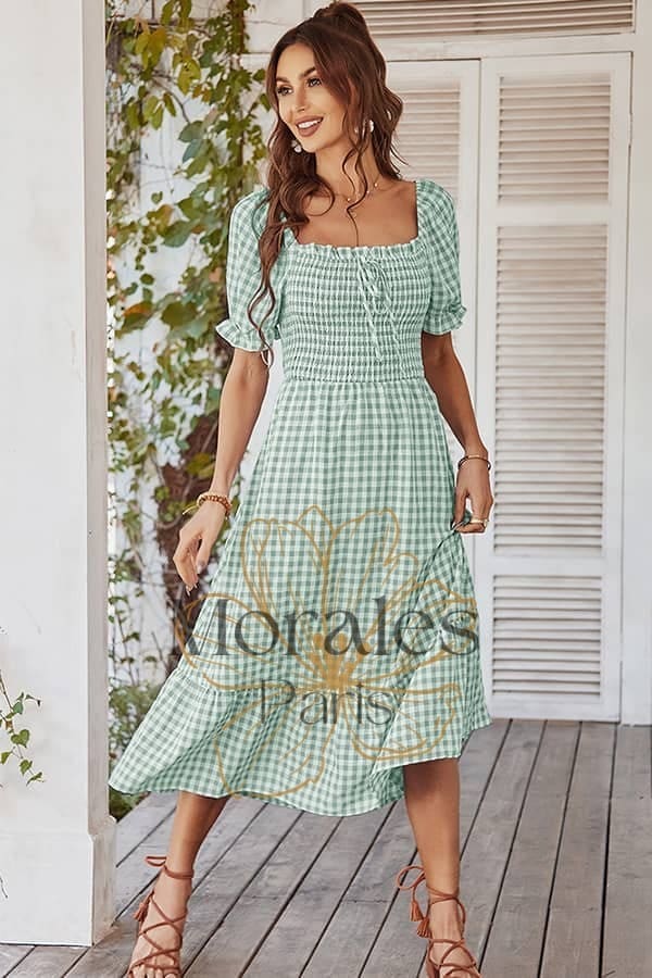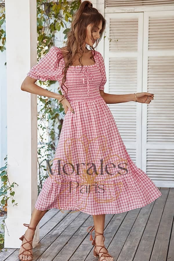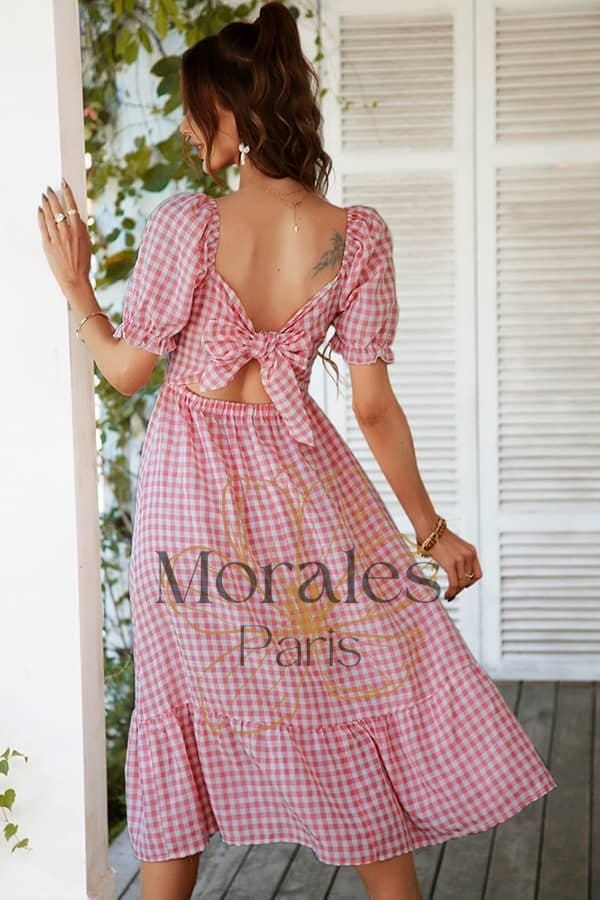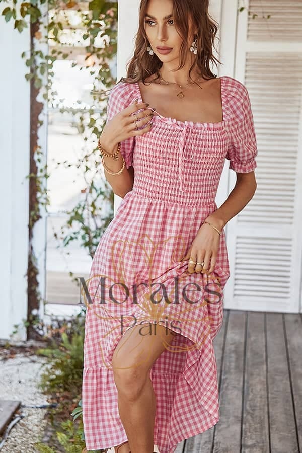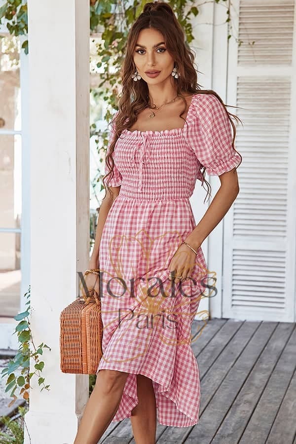 Son imprimé vichy nous transporte à lui seul dans l’univers rétro des années 80. Le choix entre le rose et le vert de cette robe champêtre contribue également à accentuer cette allure guinguette unique.