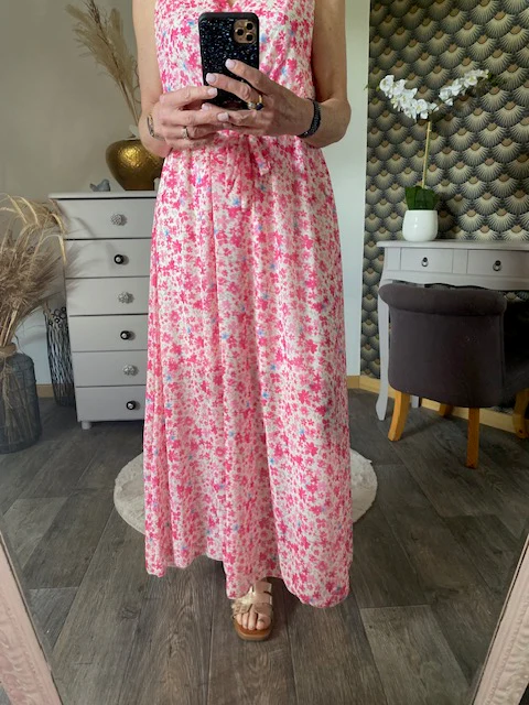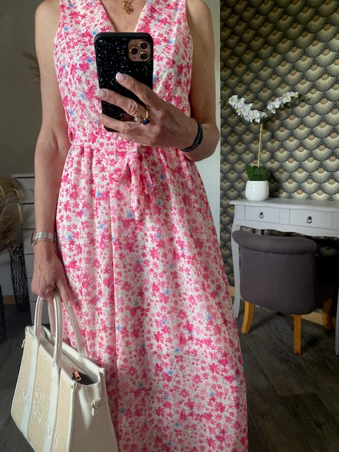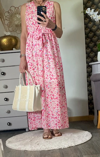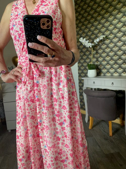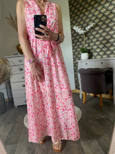 Robe longue , doublée jusqu’ aux genoux , col cache coeur , V dans la dos , élastiquée à la taille , ceinture assortie