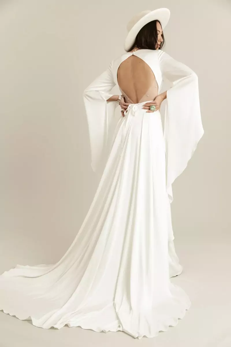 Robe de mariée boho chic époustouflante en tulle brodé de motifs graphiques.Décolleté plongeant, bretelles fines, très grand dos nu.Coupe sirène, longue traîne. Taille : 38/40Une seule pièce disponible. Pourquoi on l’aime ? Pour ses lignes et son design pensés pour sublimer la silhouette.