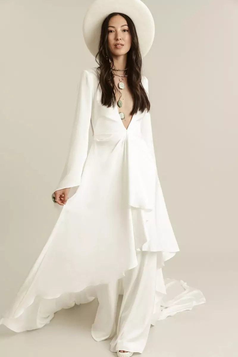 Robe de mariée boho chic époustouflante en tulle brodé de motifs graphiques.
