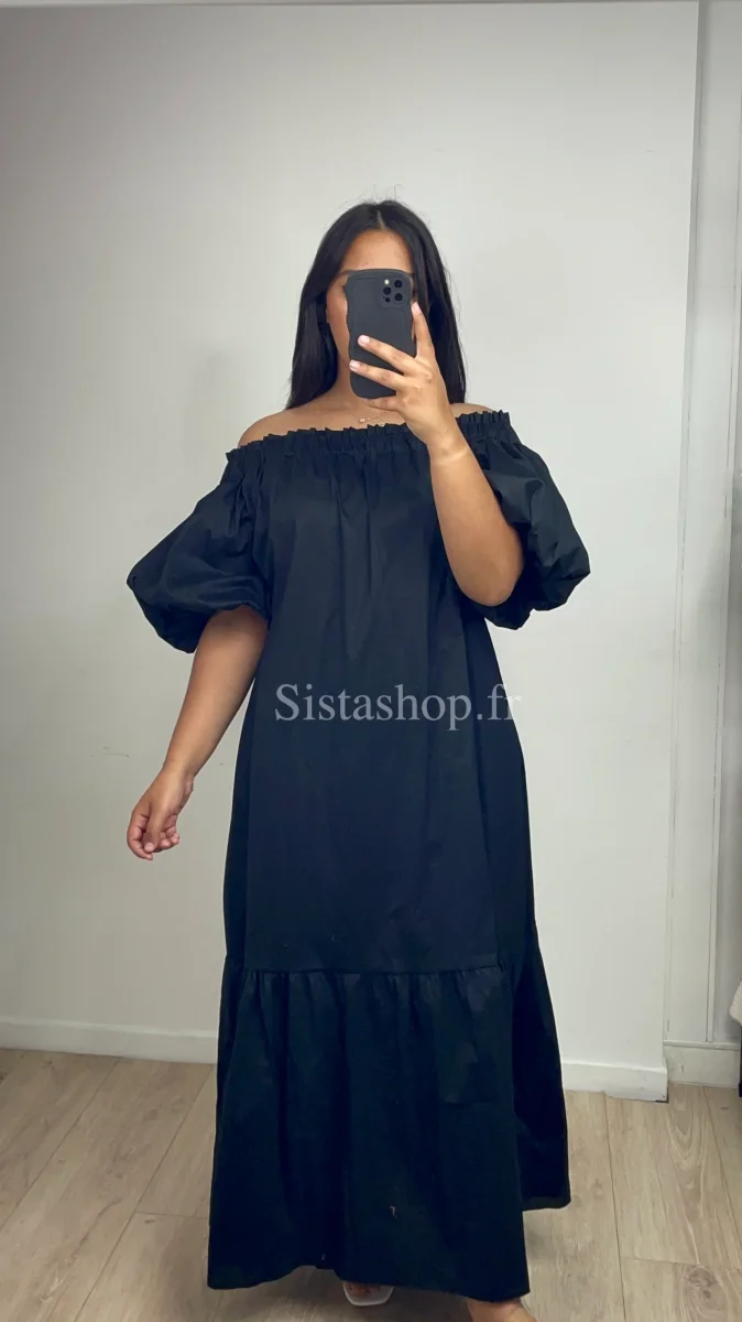 Robe longue fluide et évasée avec manches courtes ballon et col bateau. Le tissu léger offre confort et liberté de mouvement. Parfaite pour les journées chaudes et les occasions spéciales.