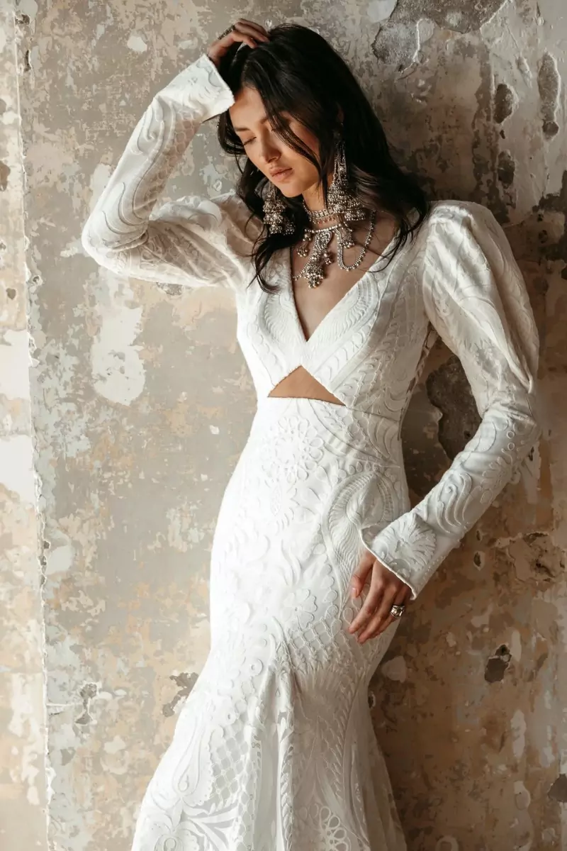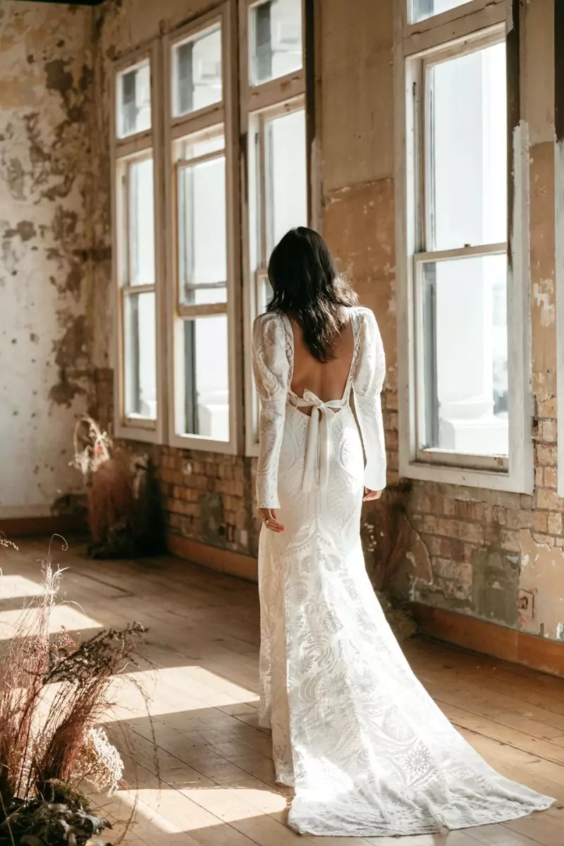 Robe de mariée bohème chic à manches longues originale.En dentelle de coton brodé sur un crêpe fin.Coupe sirène, col V, grand dos nu noué, longue traîne. Taille : 38/40Une seule pièce disponible. Pourquoi on l’aime ? Pour ses découpes graphiques sublimes.