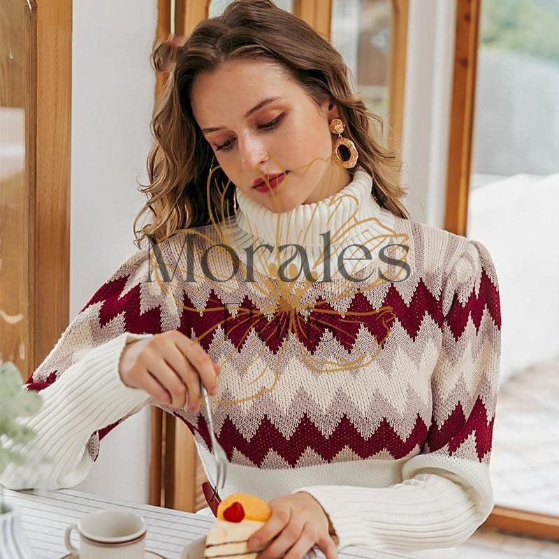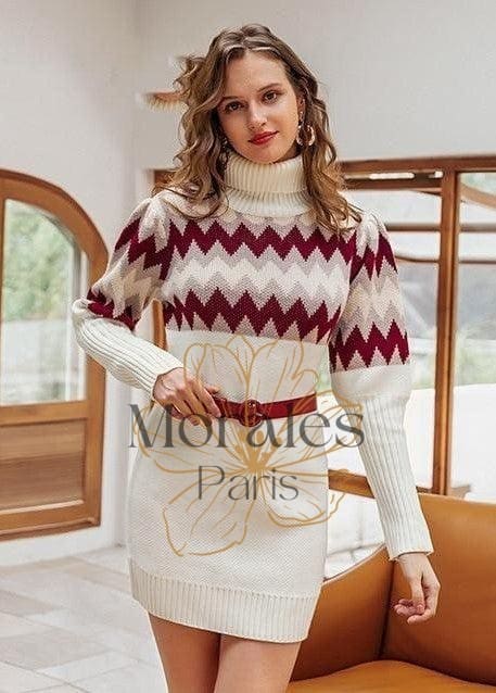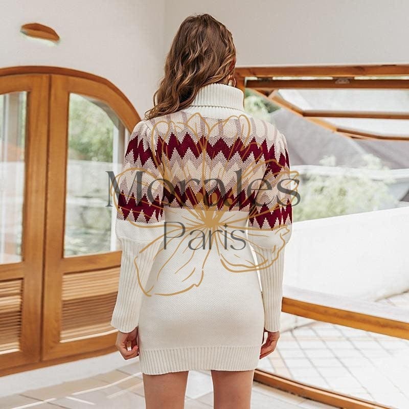 Le froid arrive et cette petite robe bohème courte en acrilyque séduit toutes les jeunes femmes. Elle est mise en valeur par un motif géométrique sur le buste qui rehausse le blanc de la robe. Son col roulé et ses manches longues bouffantes sur la partie haute du bras en font une pièce unique. Vous pouvez l’accessoiriser avec une fine ceinture autour de la taille.