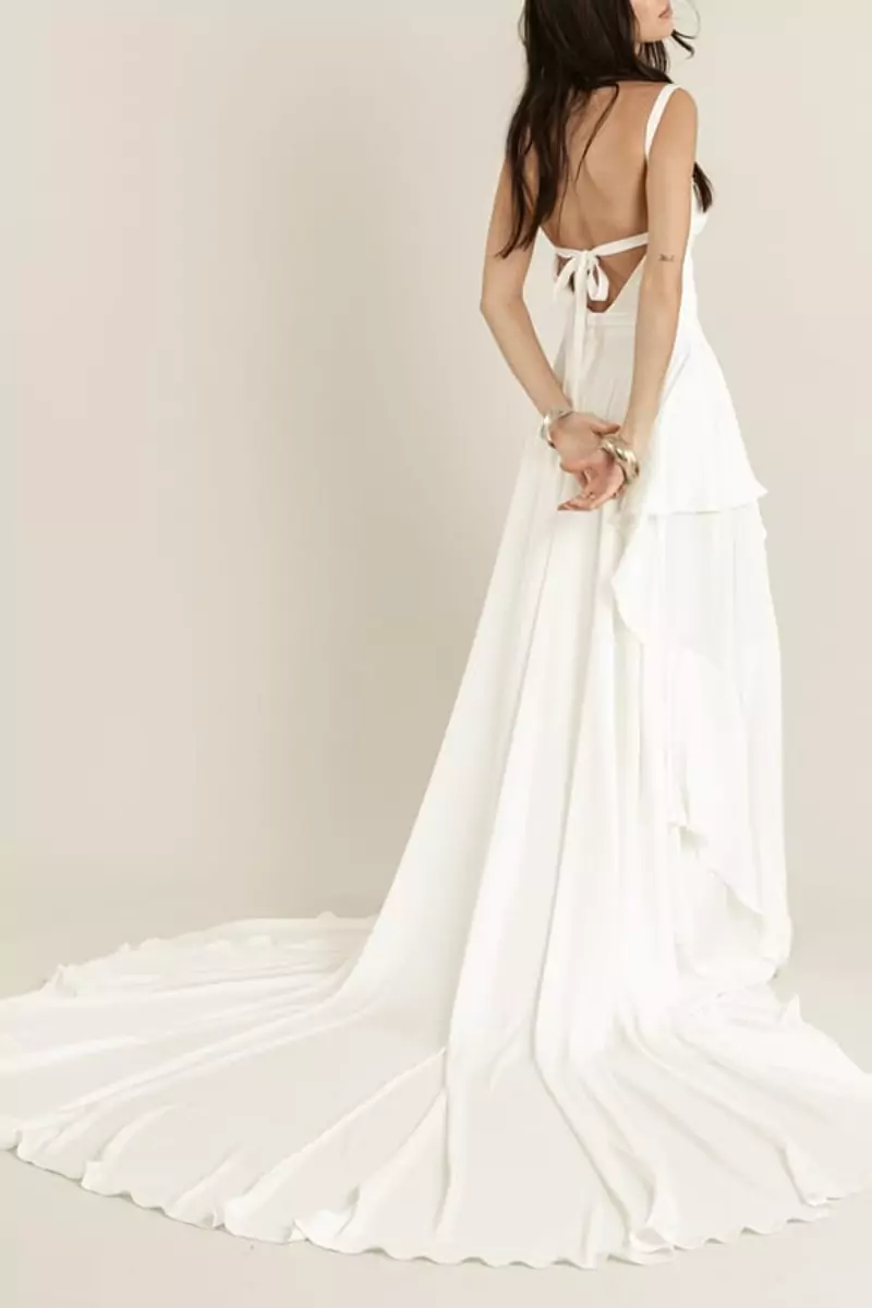 Grand dos nu, jupe fluide et ample, avec volants et 2 fentes.
