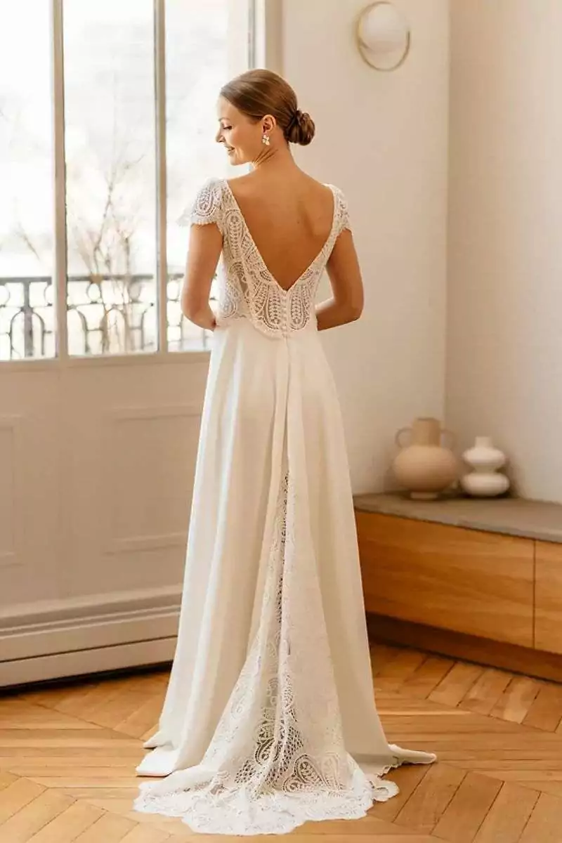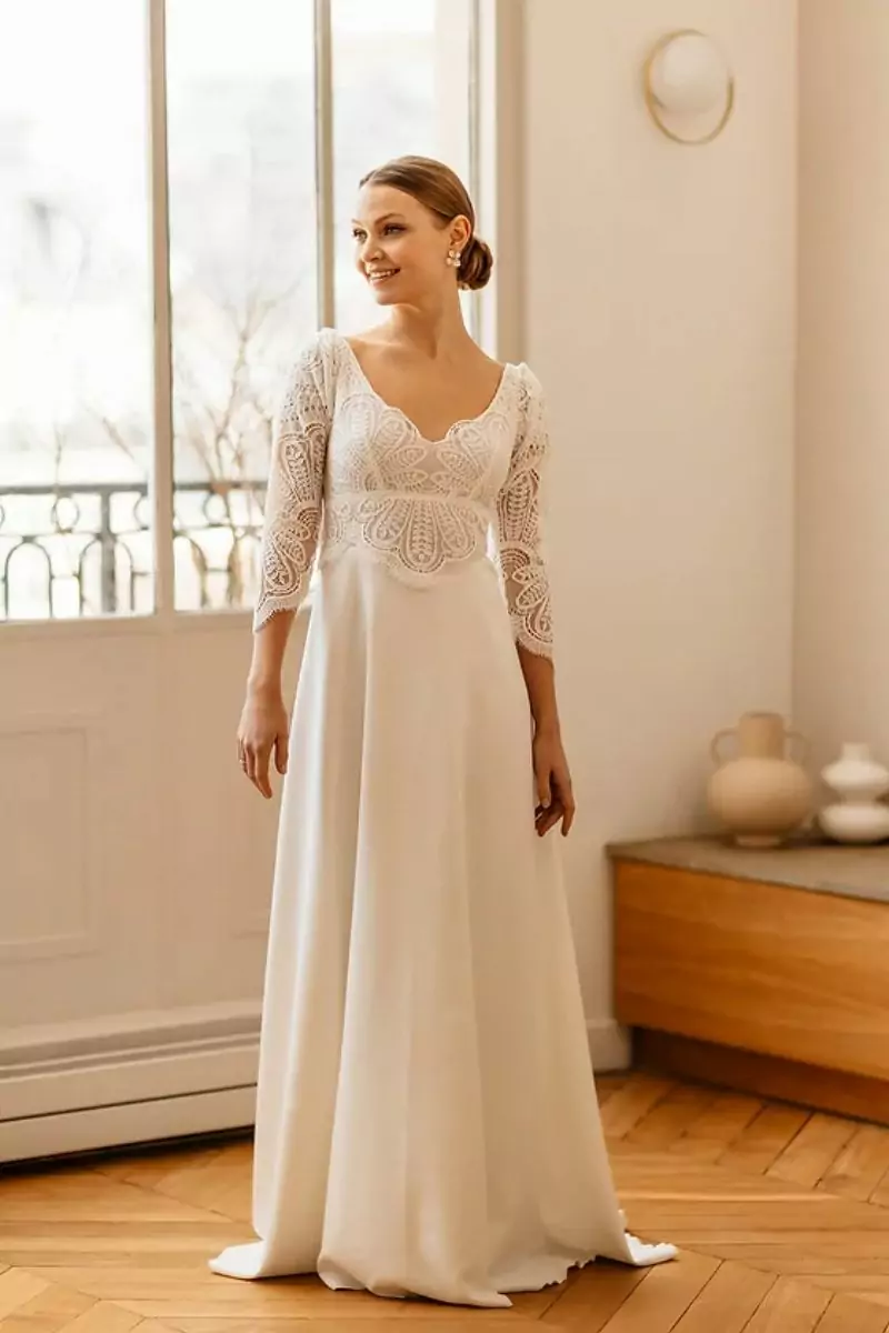 Buste en dentelle de Calais, manches 3/4, col V, dos nu V boutonné.