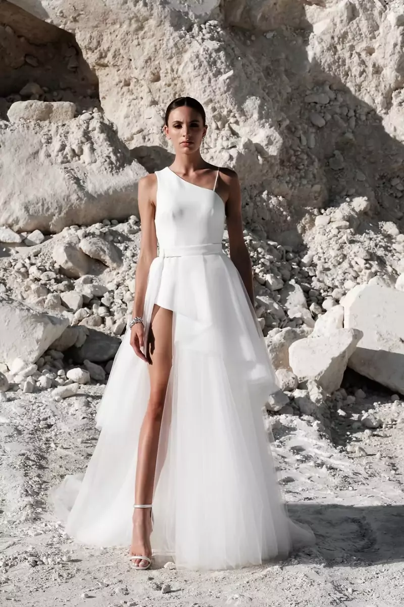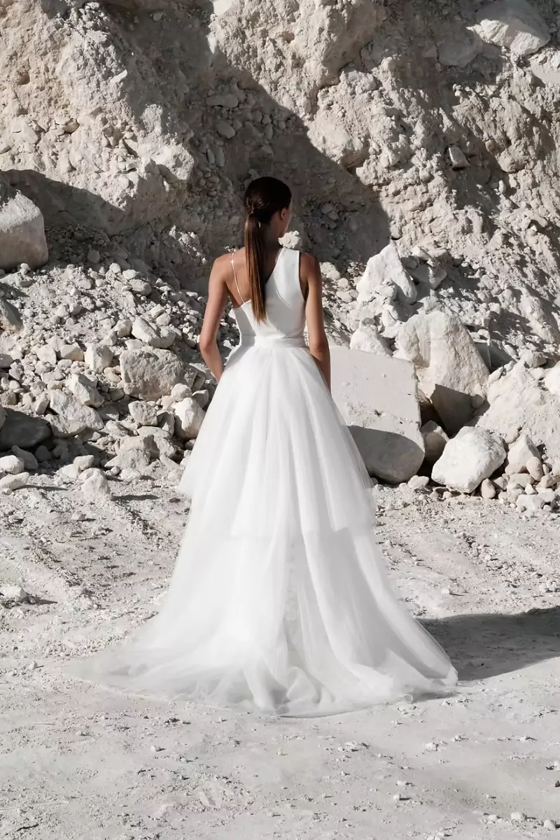 Robe de mariée originale et 2-en-1, made in France.Body asymétrique en crâpe mat uni avec une bretelle larget et une bretelle en chaine.Surjupe amovible composée de jupons en tulle en tulle, avec fente latérale.À transformer en ensemble jupe courte ou pantalon pour la soirée. Taille : 38/40Une seule pièce disponible. Pourquoi on l’aime ? Pour […]