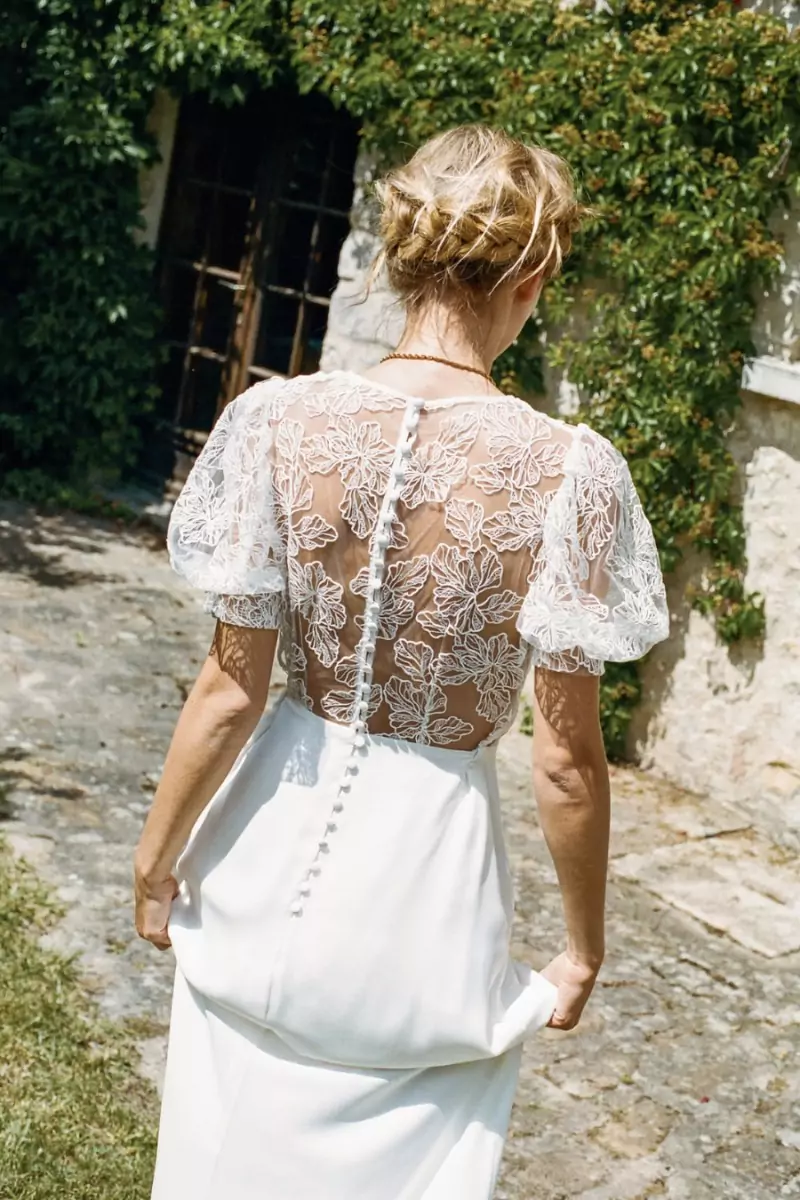Haut en tulle brodé, décolleté cache-coeur, manches ballon, dos nu transparent boutonné.