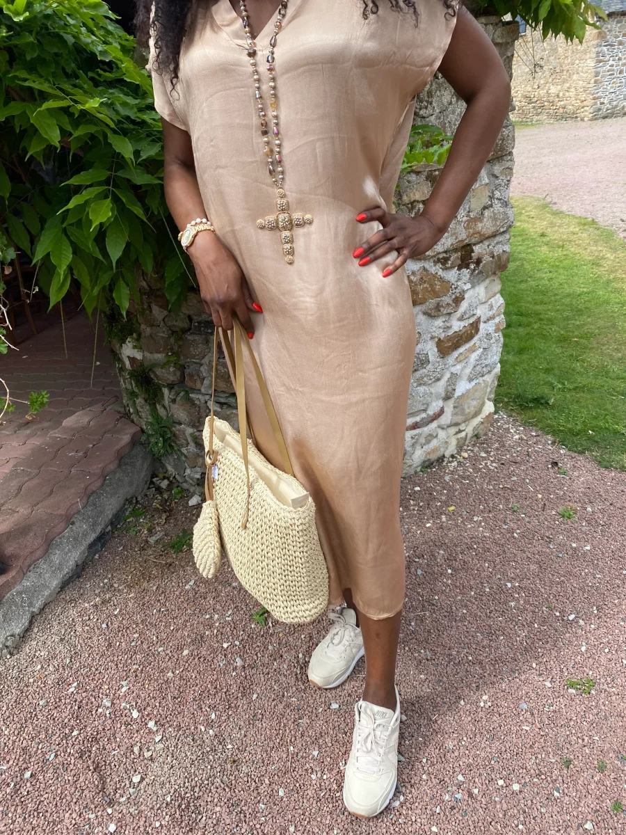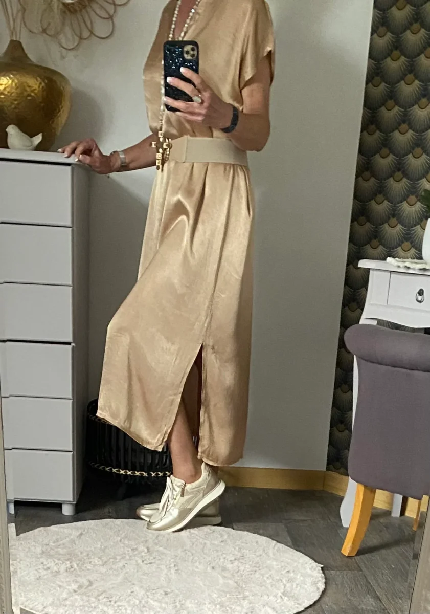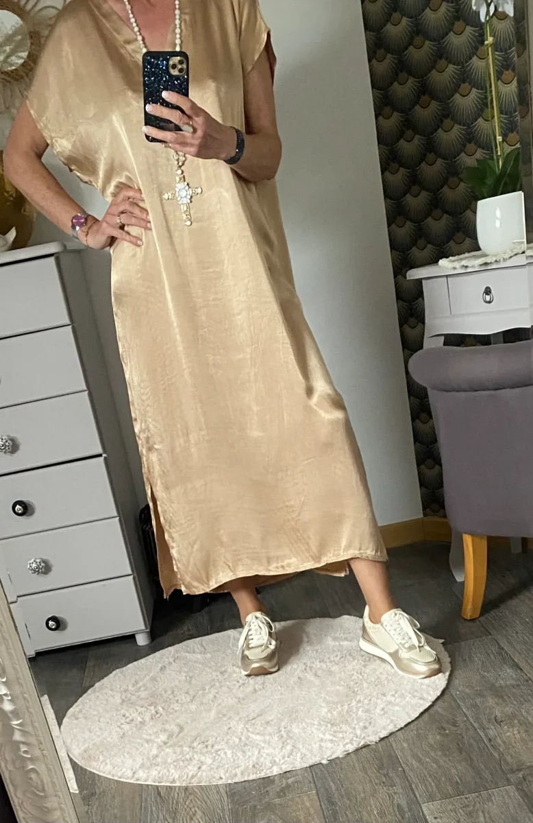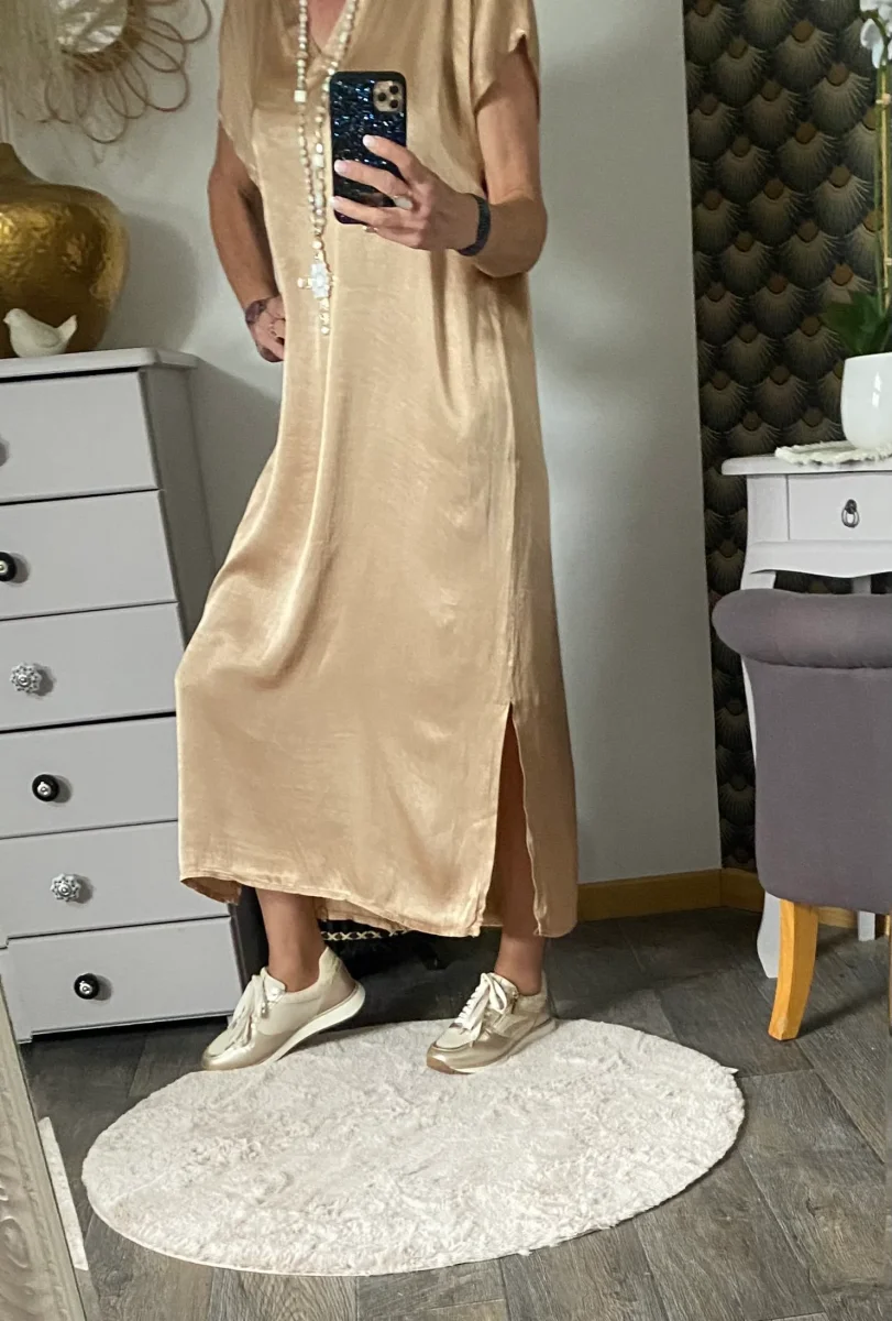 Robe longue avec fentes sur le coté , col v , manches courtes , peut etre ceinturée
