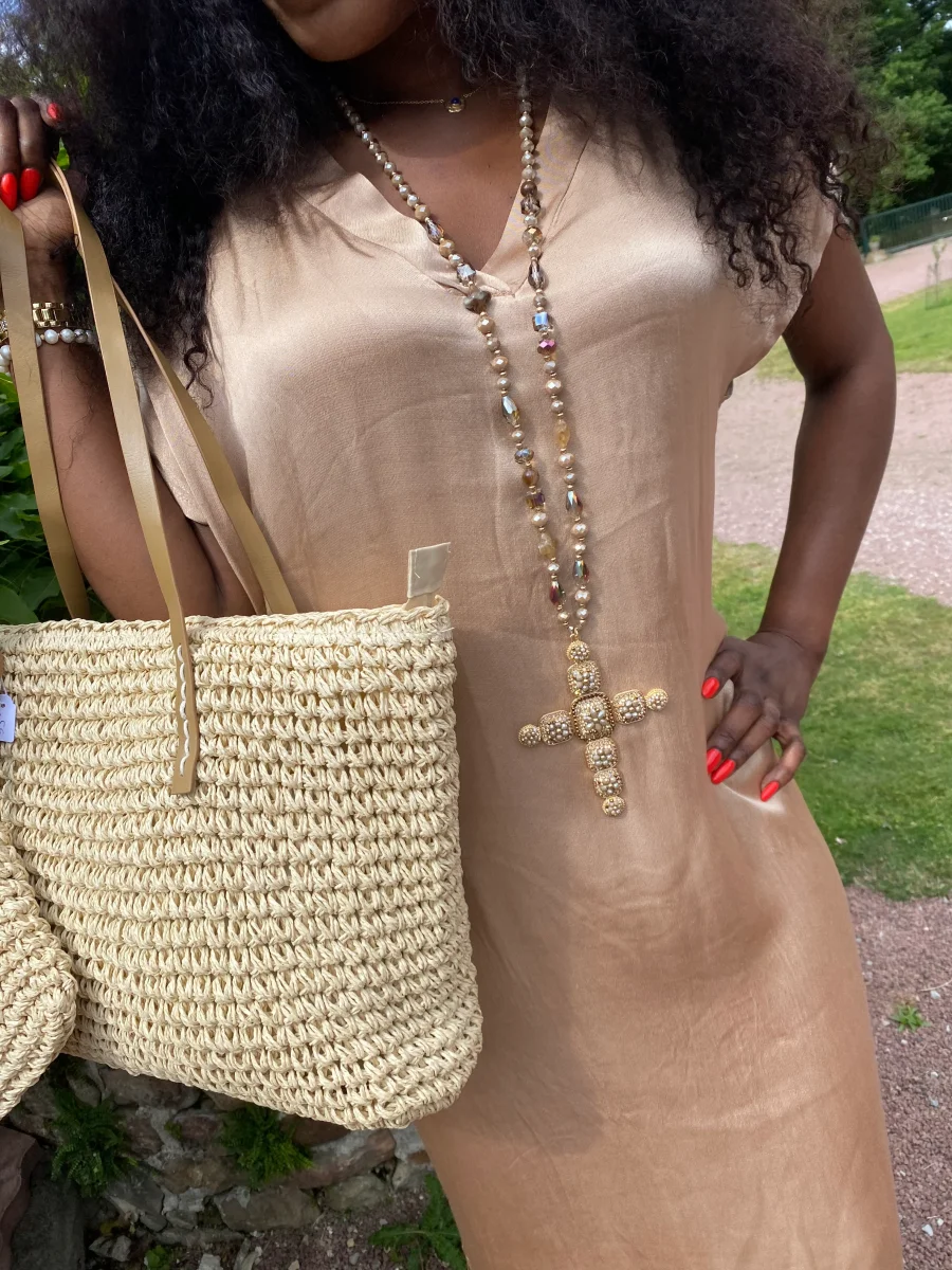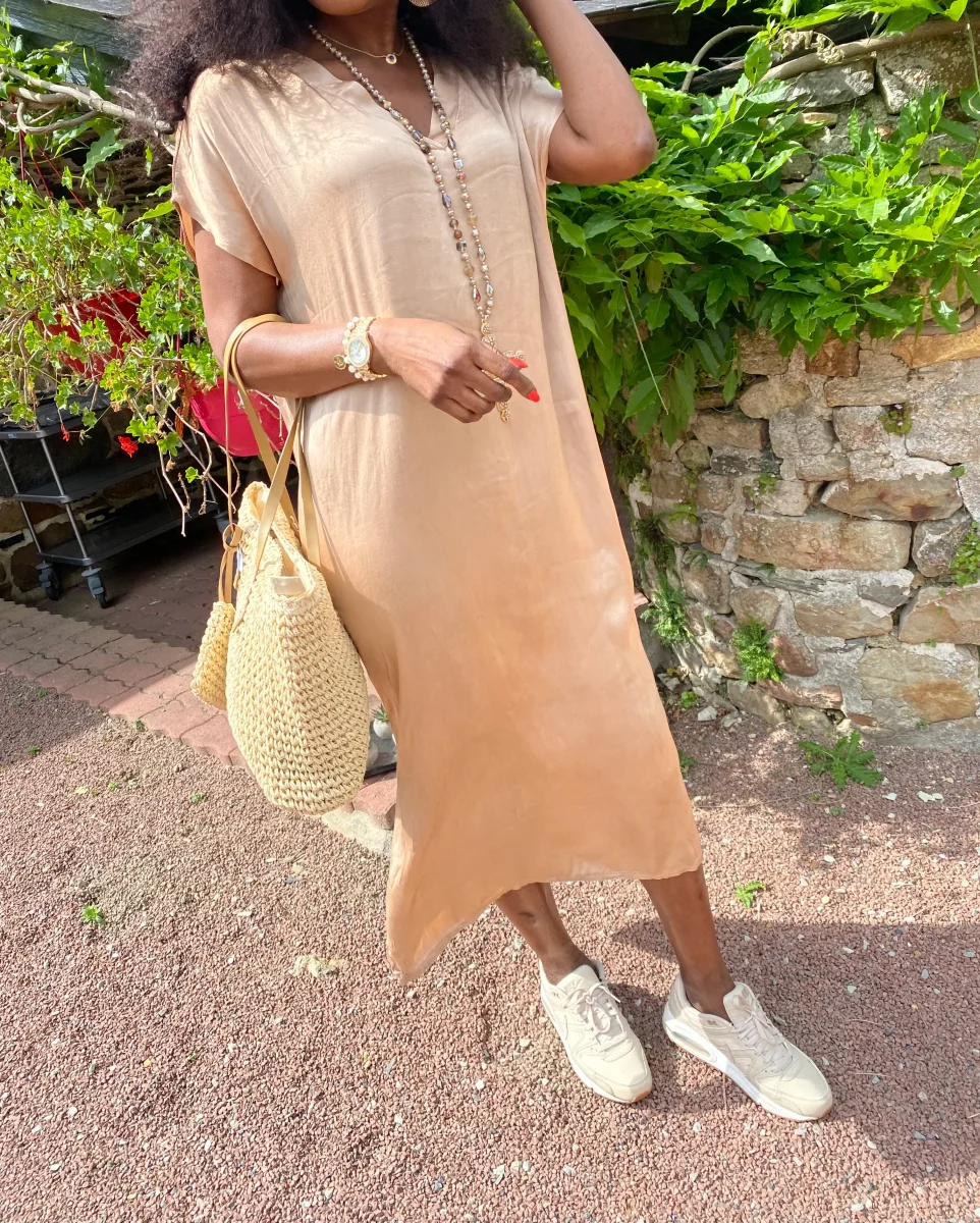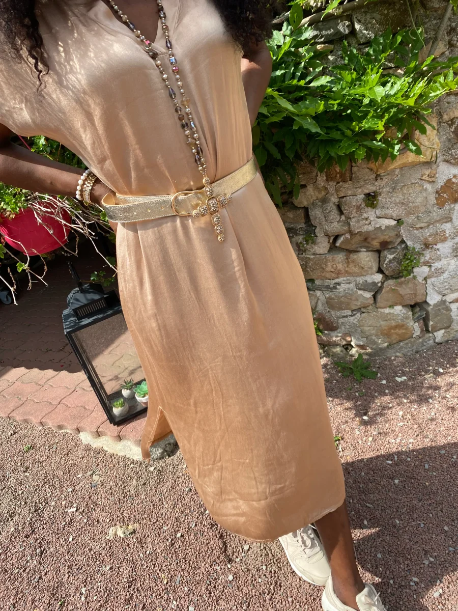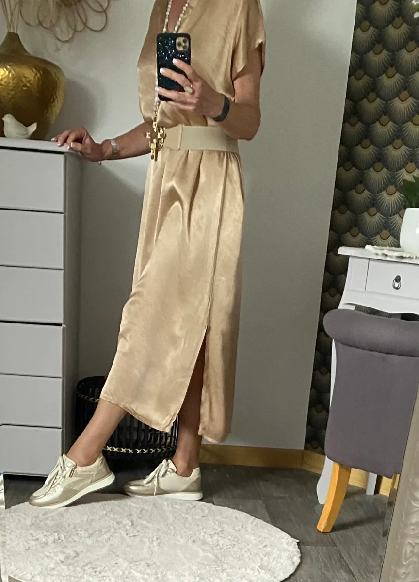 Robe longue avec fentes sur le coté , col v , manches courtes , peut etre ceinturée