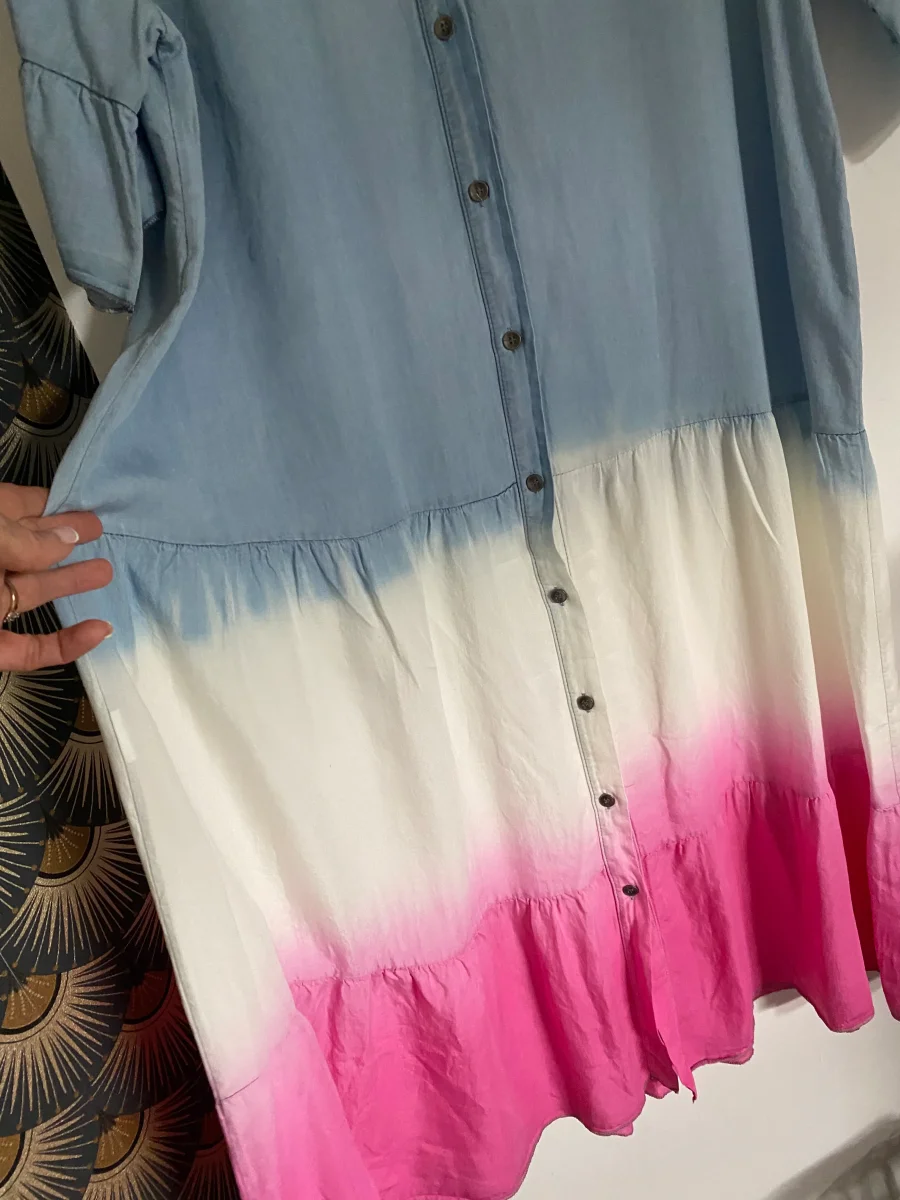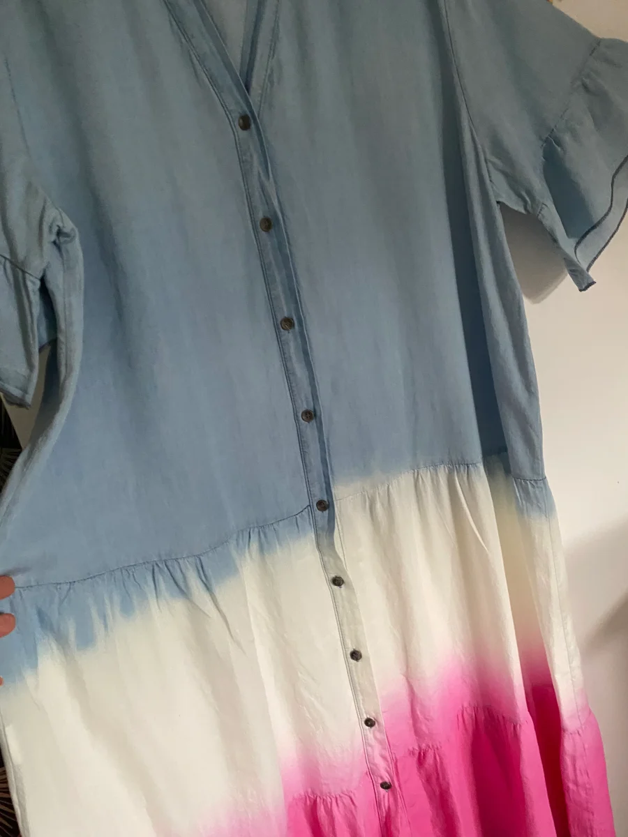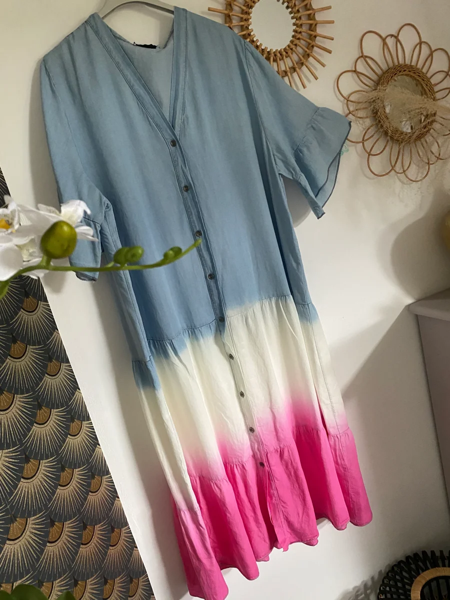 Robe longue , manches courtes col v , fermée par bouton , dégradé de couleur , non doublée . Très légère et agréable sur la peau .