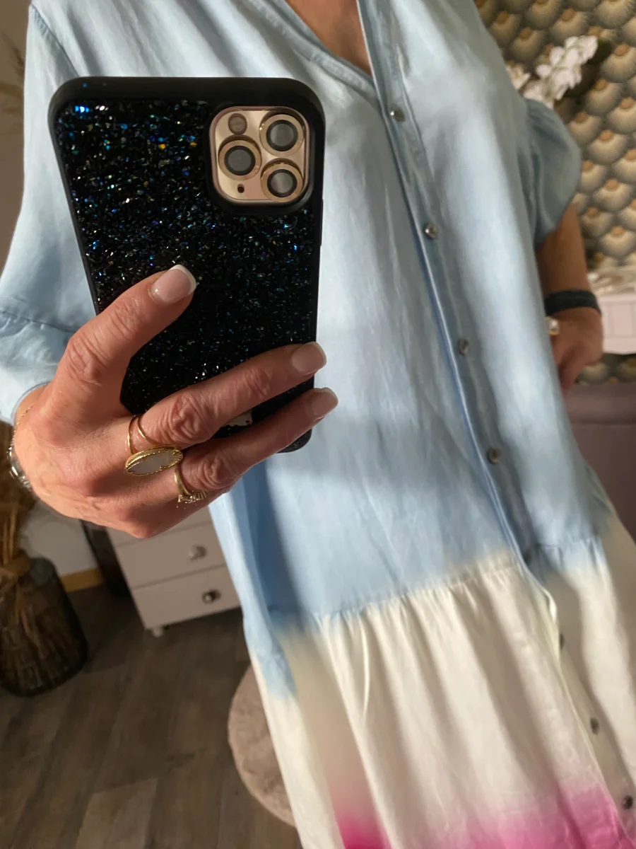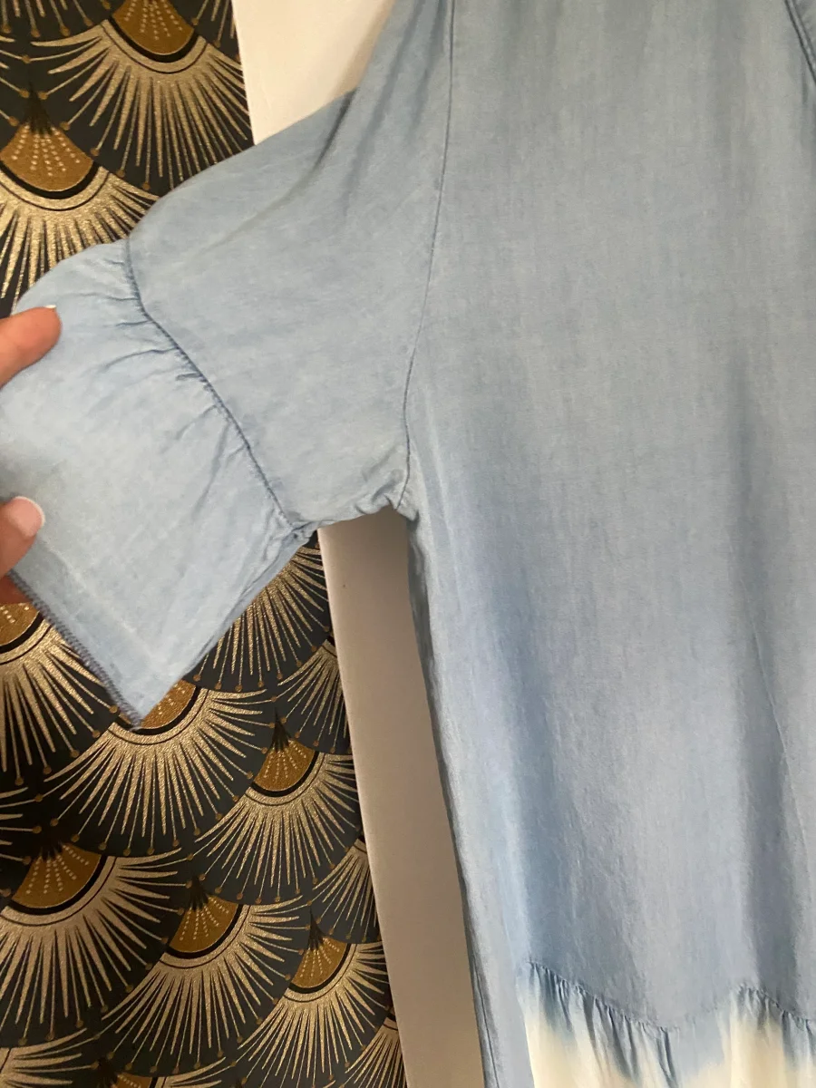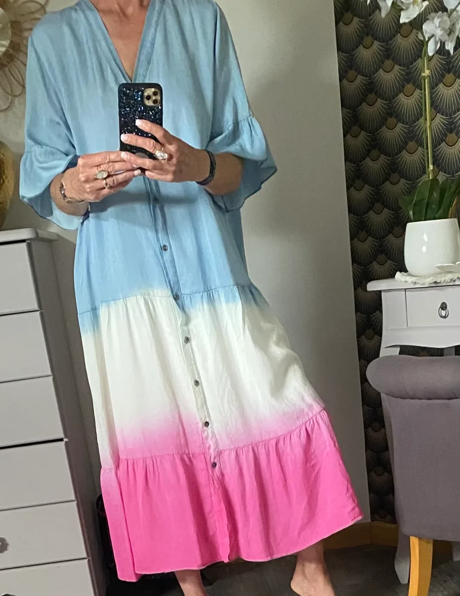 Robe longue , manches courtes col v , fermée par bouton , dégradé de couleur , non doublée . Très légère et agréable sur la peau . NOUVELLE COLLECTION ETE 2025 MADE IN ITALIE Composition: 100% LYOCELL Longueur: 119 cm largeur: 63 cm