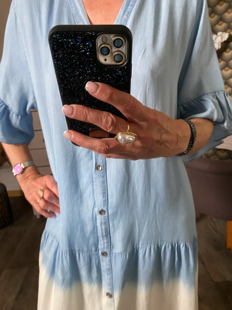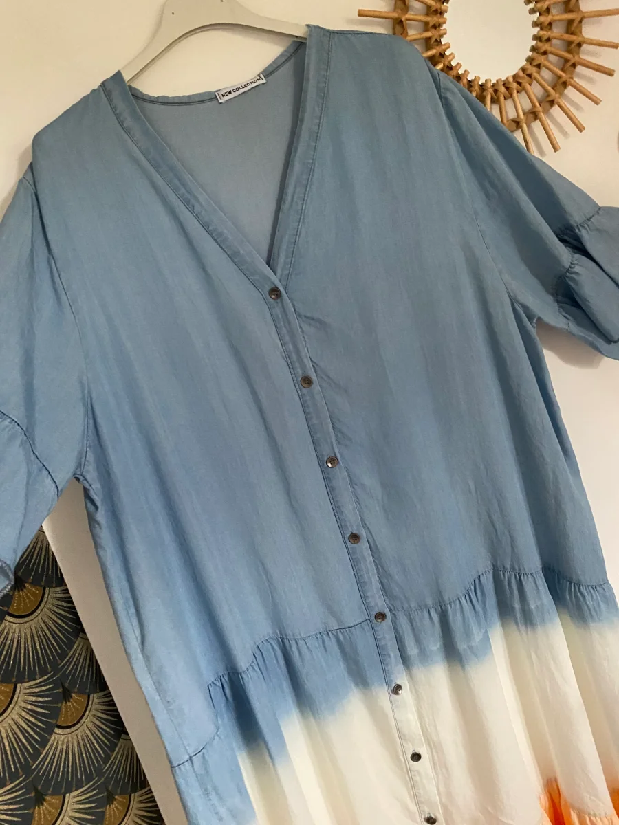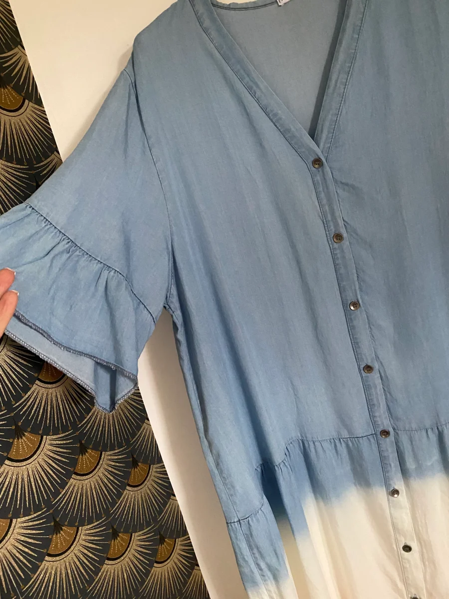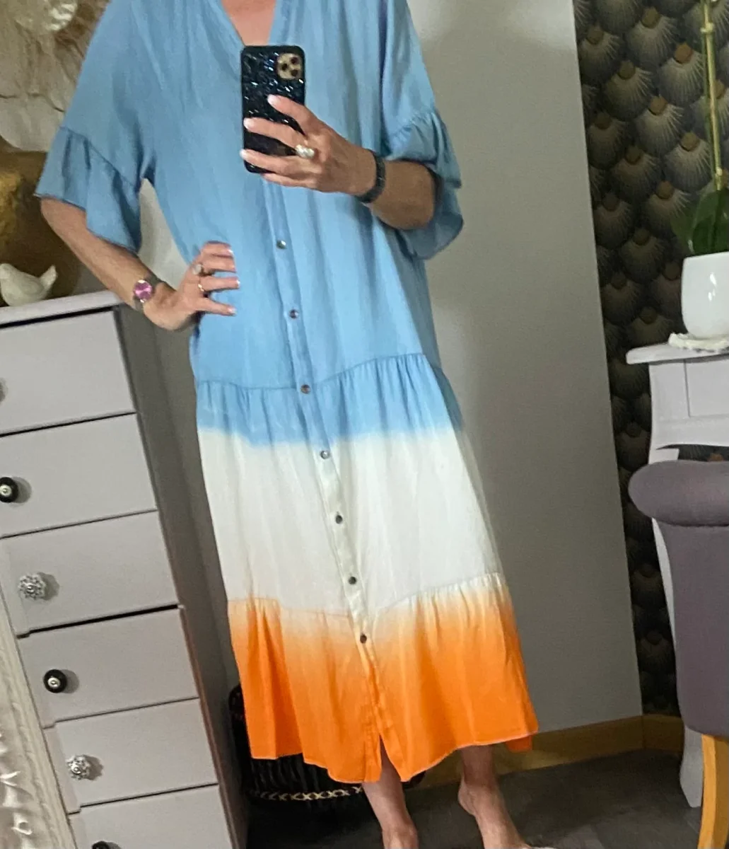 Robe longue non doublée , , en lyocell , manches courtes, col V , fermeture par boutons , très agréable à porter