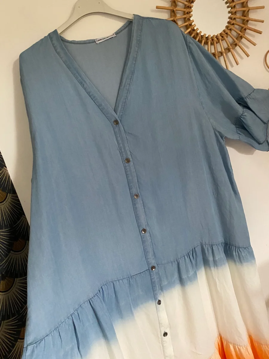 Robe longue non doublée , , en lyocell , manches courtes, col V , fermeture par boutons , très agréable à porter NOUVELLE COLLECTION ETE 2025 MADE IN ITALIE TU: 40:46 Composition : 100% lyocell Longueur: 119 cm largeur: 63 cm