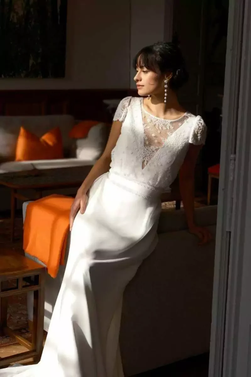 Robe de mariée élégante et épurée, en crêpe de soie.