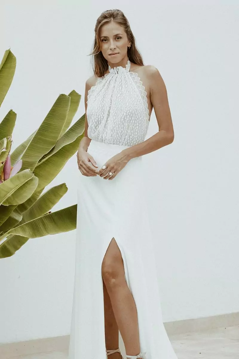 Robe de mariée élégante et épurée, en crêpe de soie.Haut en dentelle, col américain souligné d’un galon festonné, grand dos nu.Jupe droite boutonnée taille haute avec fente latérale. Taille : 38/40Une seule pièce disponible. Pourquoi on l’aime ? Pour ses lignes contemporaines.