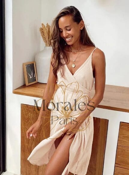 Sa coupe portefeuille est rehaussée par une taille empire et une encolure croisée en V pour une allure parfaitement chic. Son dos nu conjugue légèreté et élégance tandis que sa taille empire sublime ta silhouette, et son bas fendu t’assure un look féminin.