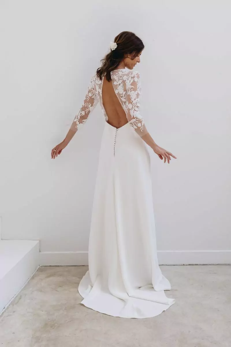 Décolleté V profond, dos nu inversé, manches 3/4.