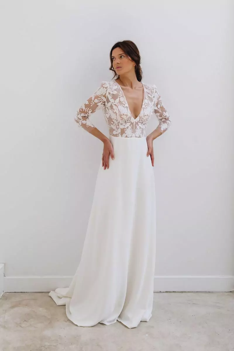 Robe de mariée élégante et délicate.Haut en tulle brodé de motifs fleuris et doublé en organza de soie.Décolleté V profond, dos nu inversé, manches 3/4.Jupe longue évasée en crêpe. Taille : 36Une seule pièce disponible. Pourquoi on l’aime ? Pour son incroyable chute de reins.