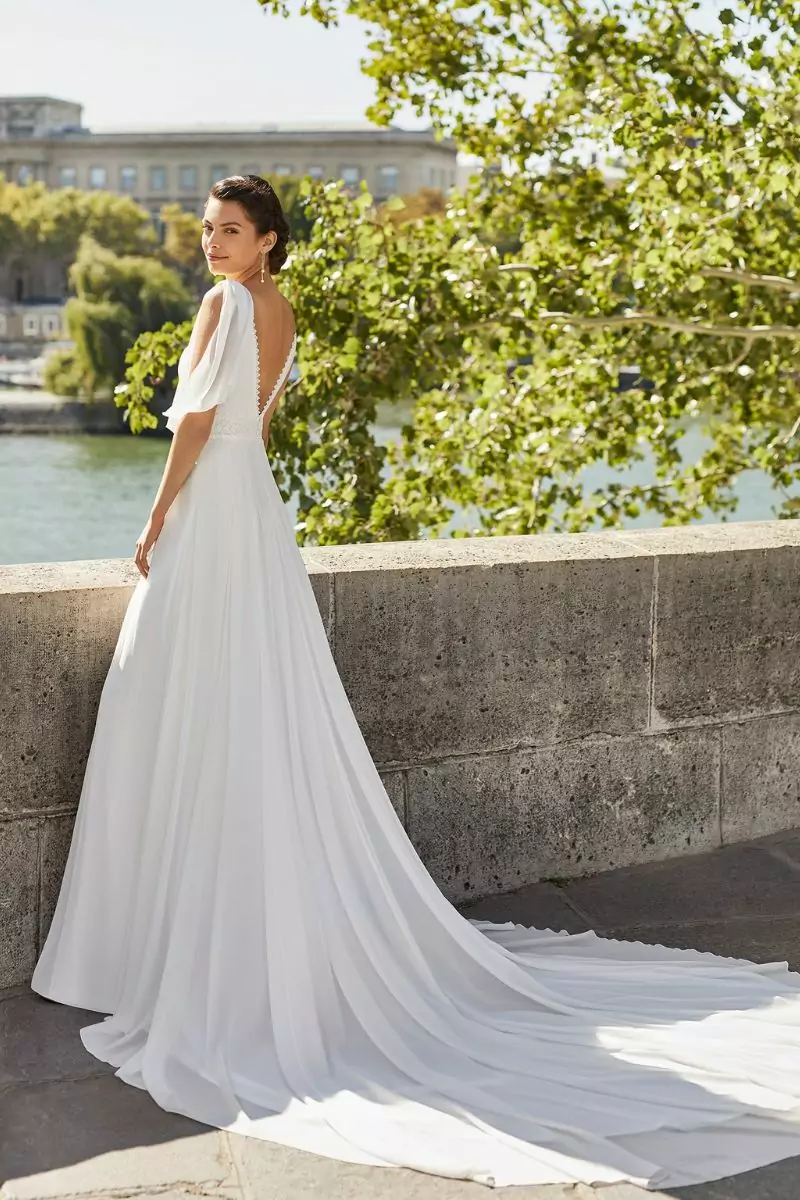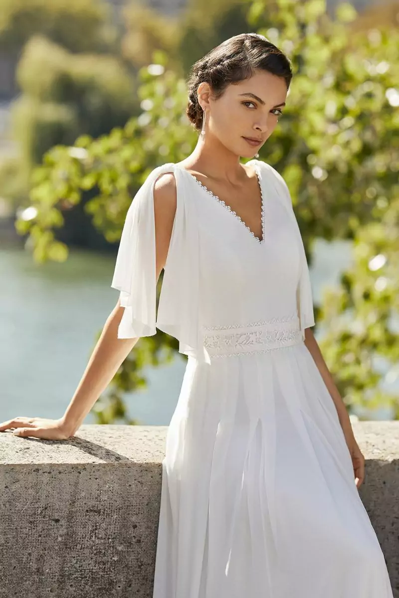 Robe de mariée sobre et minimaliste, en mousseline fluide.