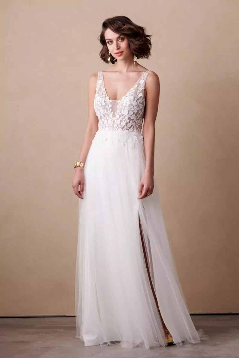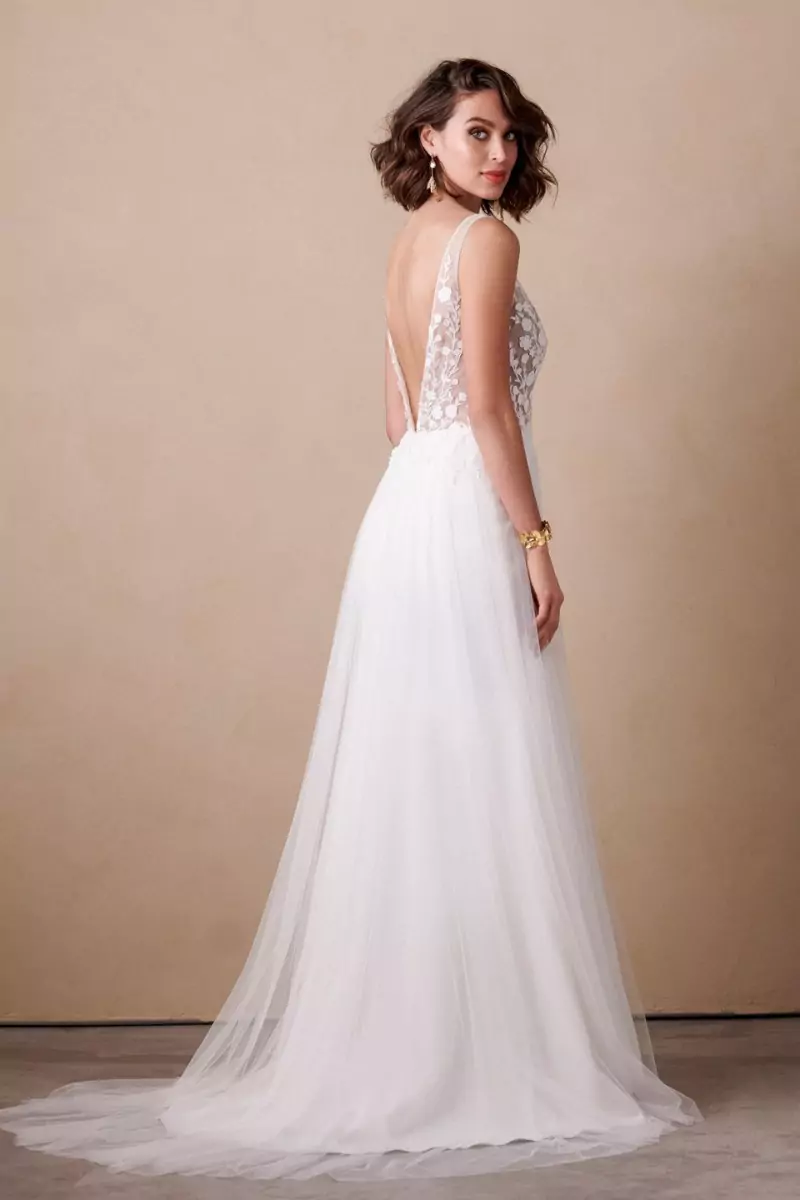 Robe de mariée bohème fluide et romantique.Buste en tulle brodé de dentelle fleurie et sequins, sans manche.Décolleté plongeant, bretelles larges, dos nu V.Taille haute, jupe en tulle légère avec fente sur le côté et traîne. Taille : 40Une seule pièce disponible. Pourquoi on l’aime ? Pour son allure de princesse un brin aérienne.