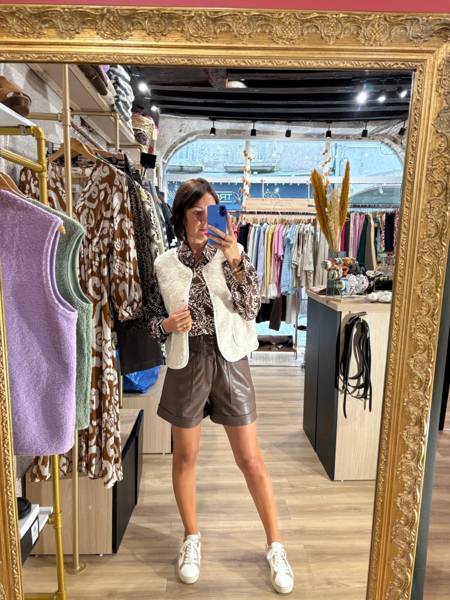 Short en cuir marron, alliant élégance et modernité. Sa coupe confortable et son matériau souple offrent un style raffiné et facile à porter, parfait pour un look tendance et audacieux.