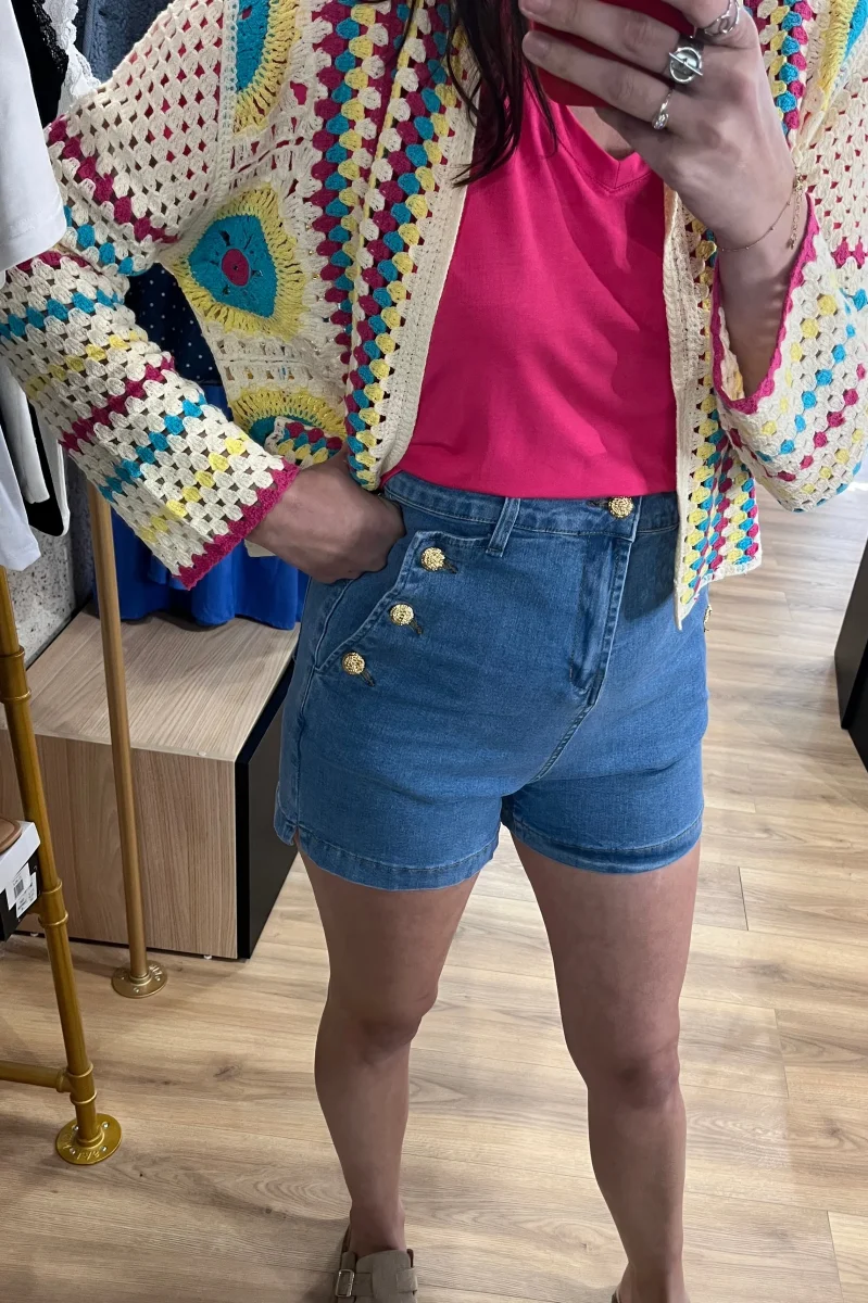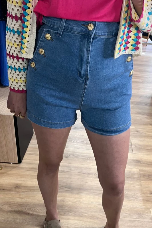 Ce short en jean revisite un classique avec une touche d’originalité : trois boutons décoratifs de chaque côté, placés au niveau des poches, qui lui donnent un charme rétro et structuré.
