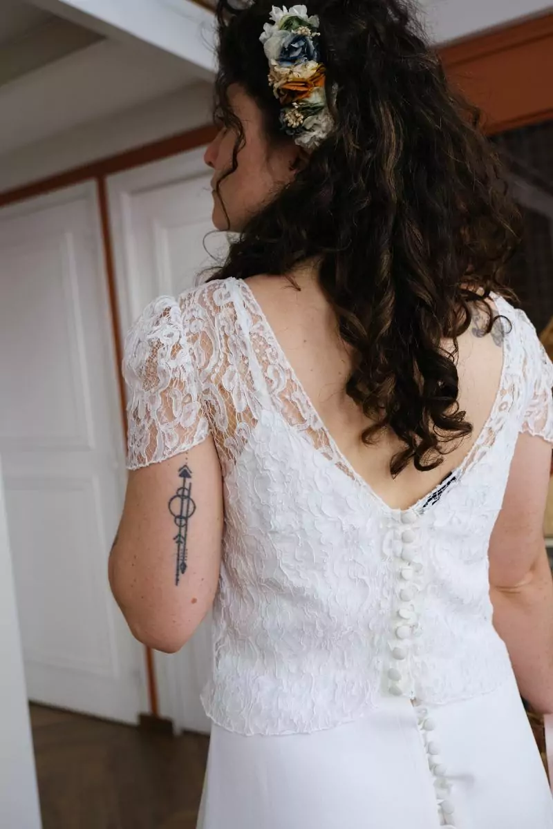 Crop top en dentelle, non doublé, à porter par-dessus une robe ou à doubler.Col rond, petites manches courtes et dos nu V boutonné. Taille : 38Une seule pièce disponible, seconde main Pourquoi on l’aime ? Pour le mix motifs traditionnels + coupe moderne.