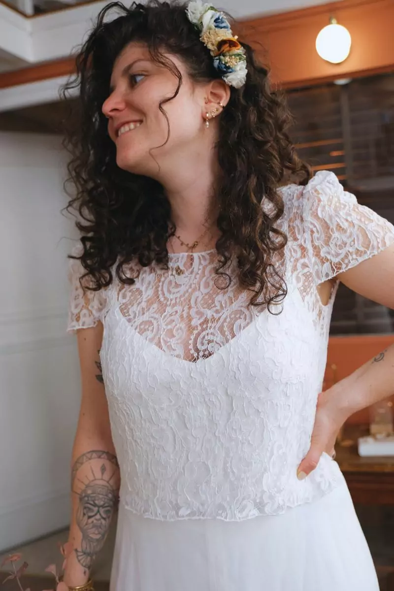 Crop top en dentelle, non doublé, à porter par-dessus une robe ou à doubler.