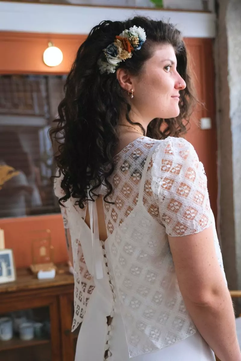 Top en dentelle à motifs graphiques, non doublé, à porter par-dessus une robe ou à doubler.Col rond, petites manches courtes et dos nu inversé fermé par un ruban de satin. Taille : 36/38 Une seule pièce disponible, seconde main Pourquoi on l’aime ? Pour son tombé fluide et délicat.