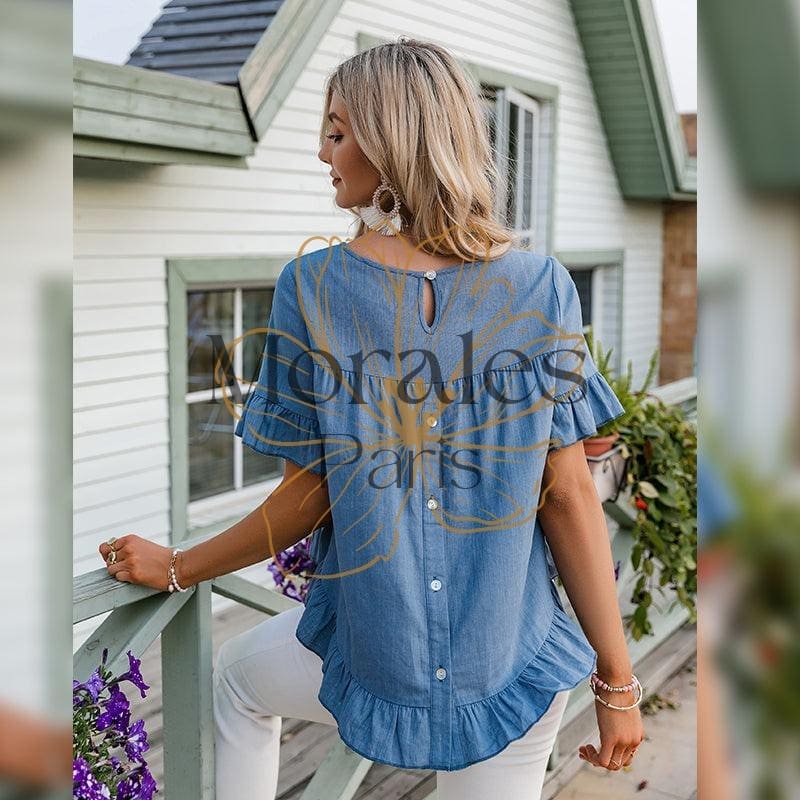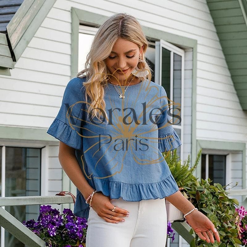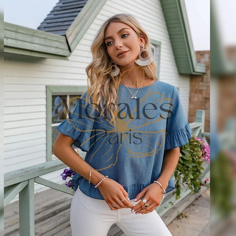 À l’approche de la saison chaude, optez pour une magnifique tunique bohème à manches courtes à volants. Son coloris bleu s’assortit facilement à votre tenue. Avec un jean clair pour un style estival ou foncé pour une allure élégante, cette pièce sera parfaite pour vos journées d’été.