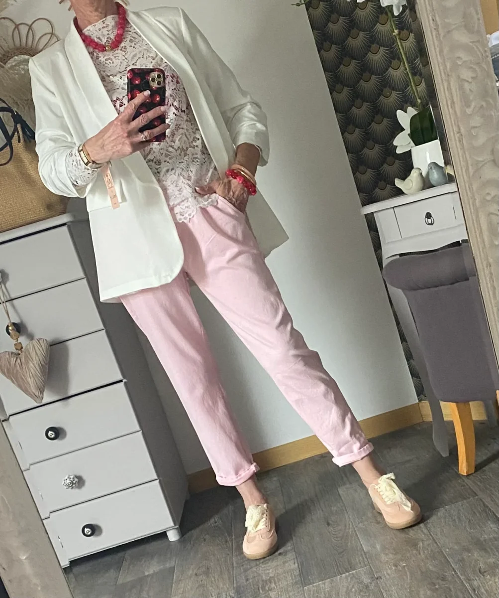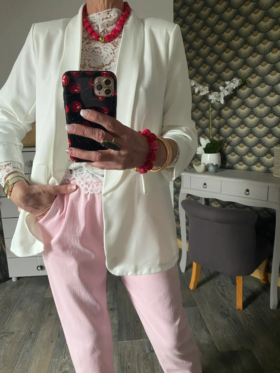 Veste blazer , doublée , manches trois quart , deux fausses poches à l ‘ avant petites épaulettes .
