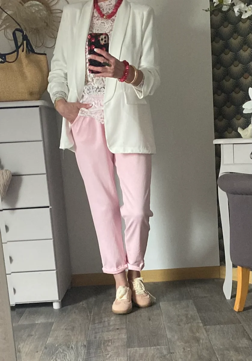 Veste blazer , doublée , manches trois quart , deux fausses poches à l ‘ avant petites épaulettes . NOUVELLE COLLECTION PRINTEMPS ETE 2026 100% POLYESTERE MADE IN ITALIE LONGUEUR 73 CM LARGEUR 53 CM