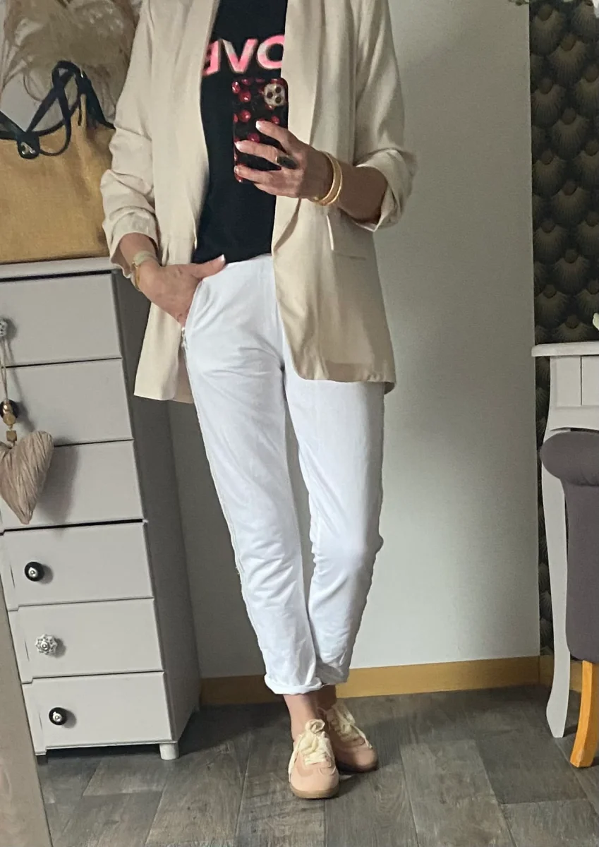 Veste blazer , doublée , manches trois quart , deux fausses poches à l ‘ avant petites épaulettes . NOUVELLE COLLECTION PRINTEMPS ETE 2026 100% POLYESTERE MADE IN ITALIE LONGUEUR 73 CM LARGEUR 53 CM