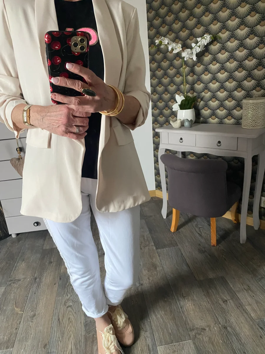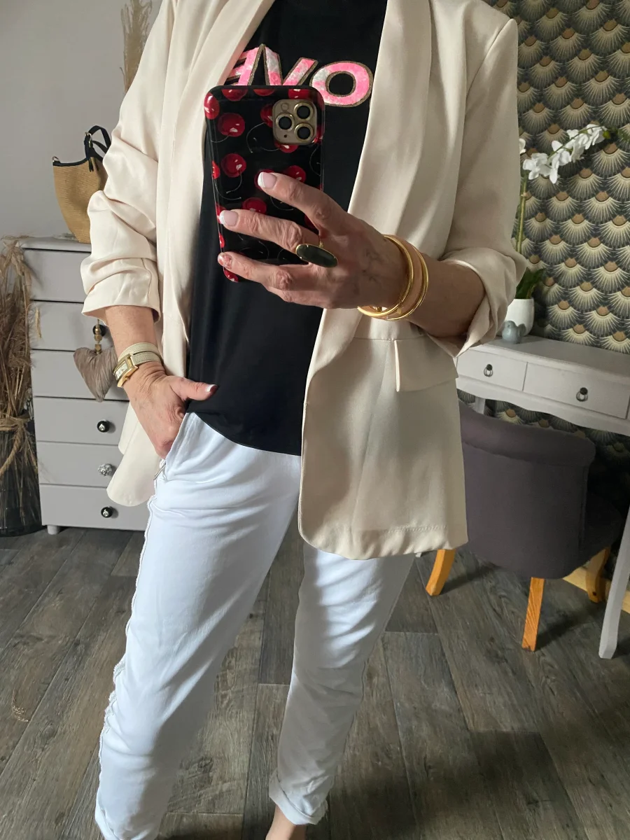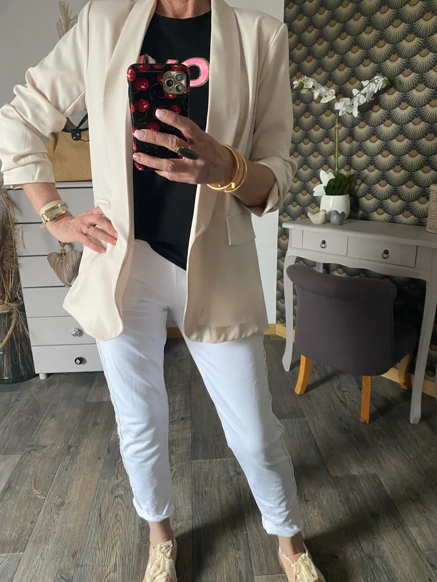 Veste blazer , doublée , manches trois quart , deux fausses poches à l ‘ avant petites épaulettes .