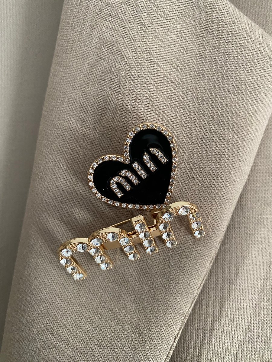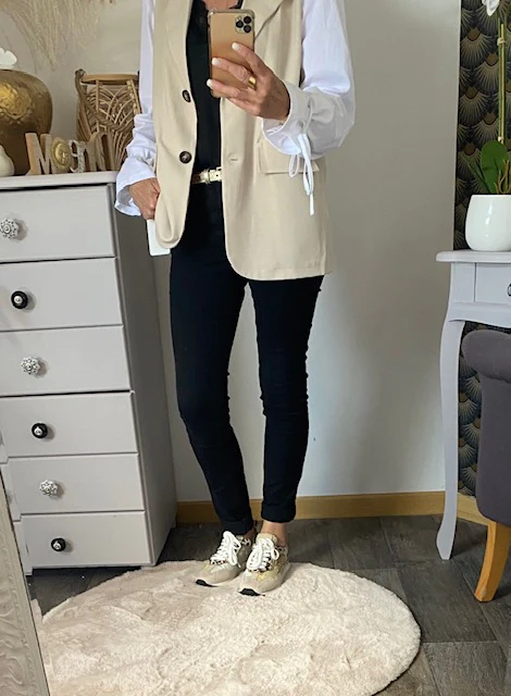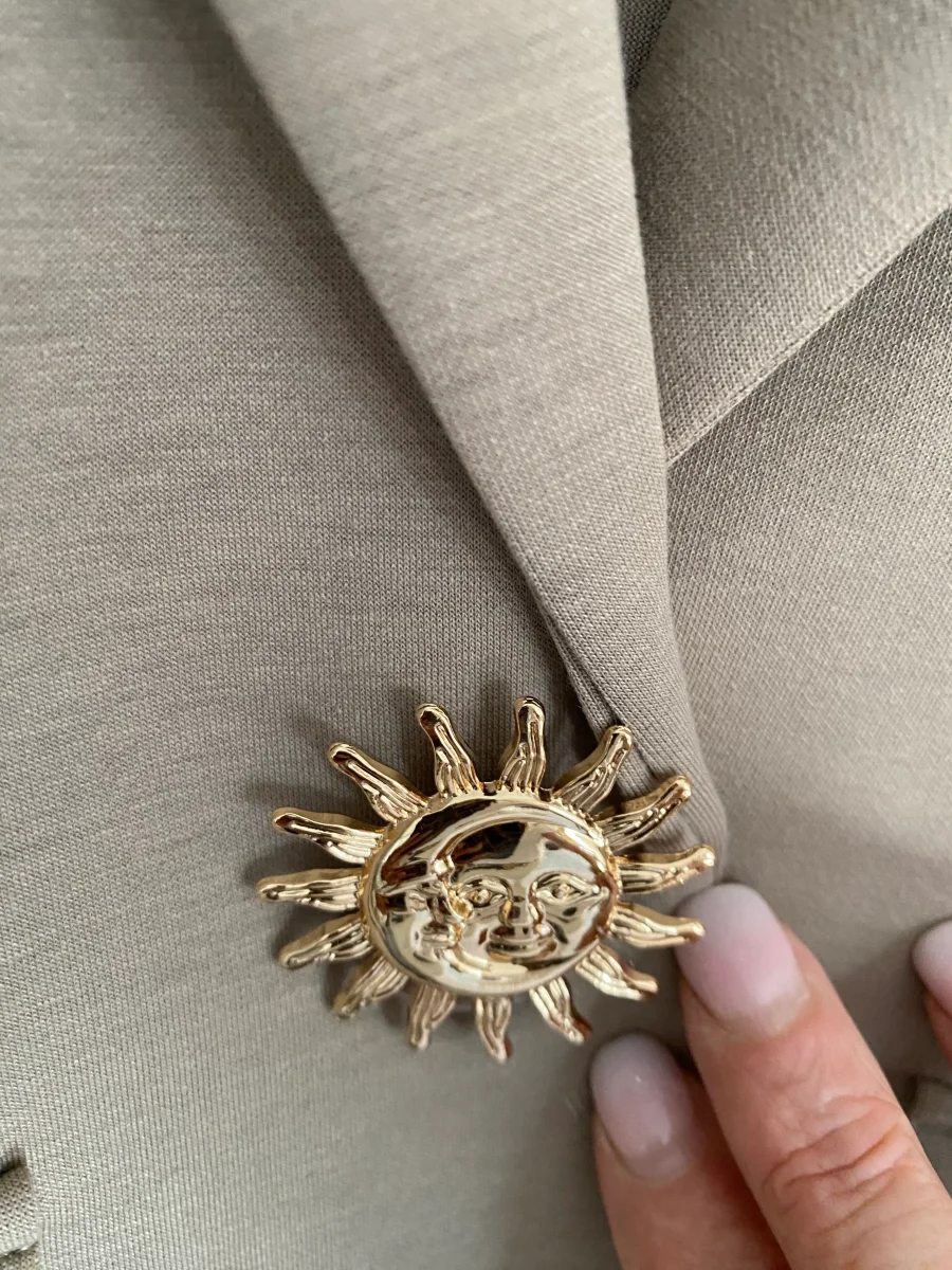 Veste coupe blazer , manches longues , deux fausses poches à l’ avant , fermeture par un bouton , deux broches sur le devant et une broche soleil cache bouton .