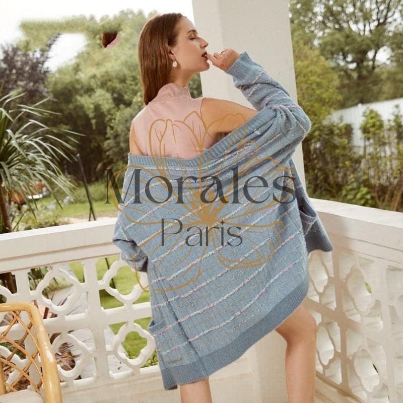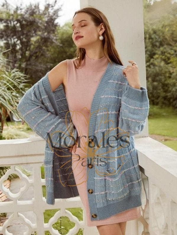Vie de Bohème vous propose cette ravissante veste ample de couleur gris bleu. Fabriquée en acrylique, elle est dotée de 2 poches et de 4 boutons de fermeture. Ses motifs rayés sont parfaits pour les journées d’automne. Accessoirisez-la avec une robe claire pour un style élégant.