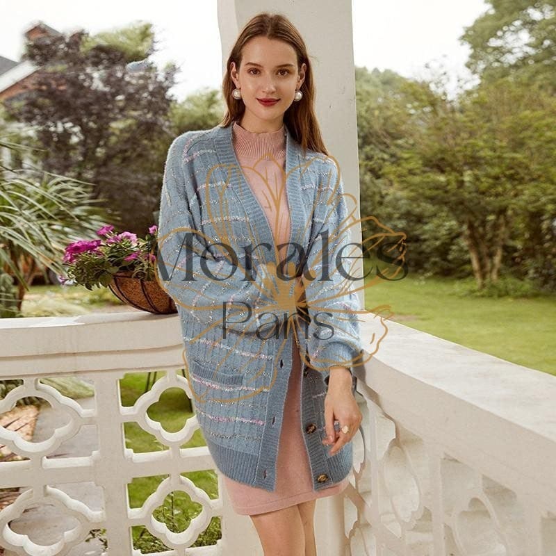 Vie de Bohème vous présente cette charmante veste ample gris bleu faite en acrylique. Elle est dotée de 2 poches et de 4 boutons de fermeture, et ses motifs rayés la rendent parfaite pour les journées d’automne. Portez-la avec une robe claire pour un look élégant.