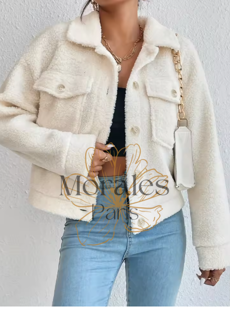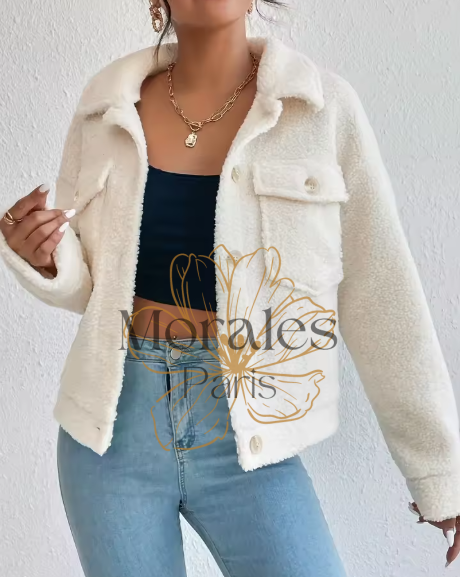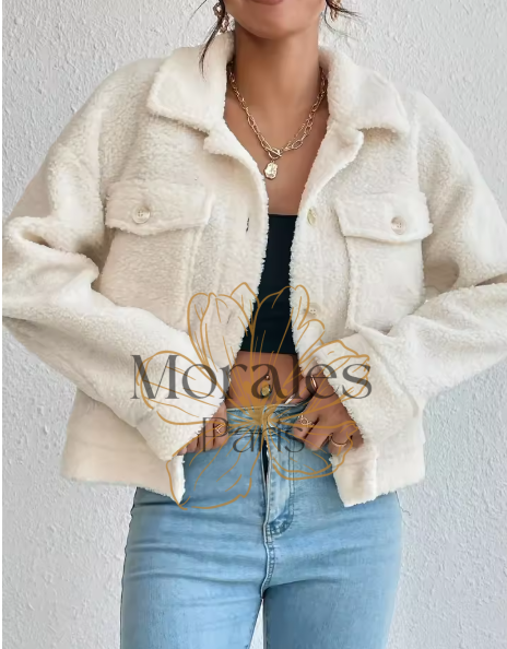 Veste Bohème Chaude en Fausse Fourrure chez Vie de Bohème : Disponible en Abricot et en Tailles S, M et L, cette veste élégante est équipée de quatre boutons de fermeture et de deux poches. Elle se porte très bien avec un jeans clair.