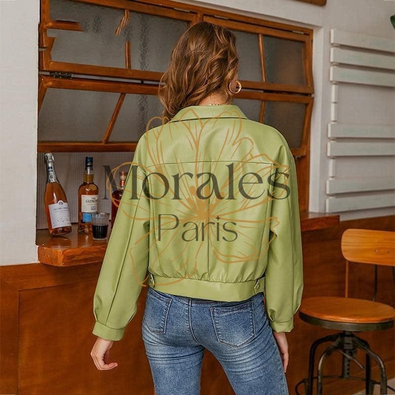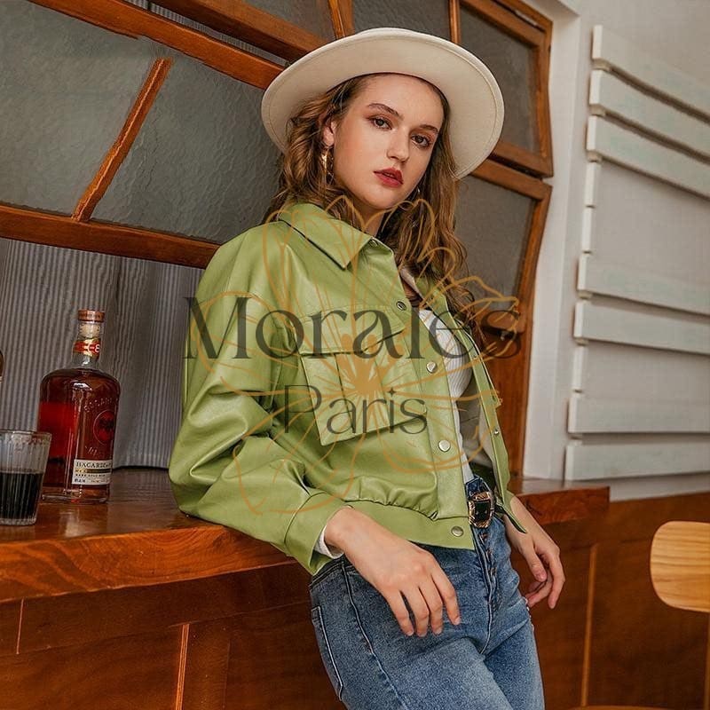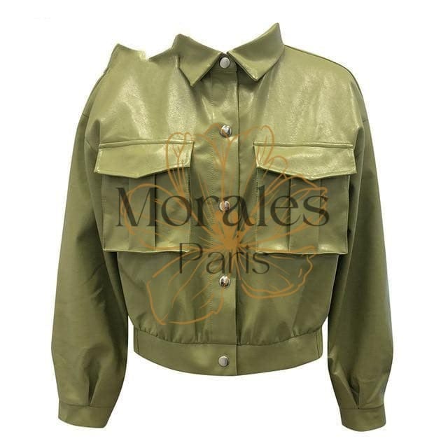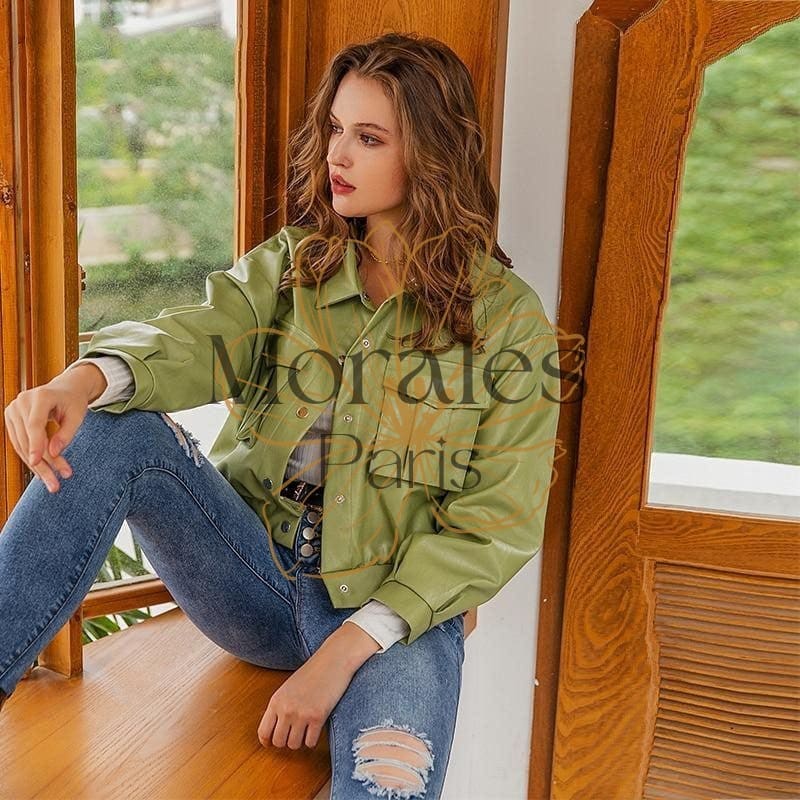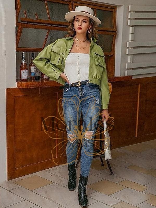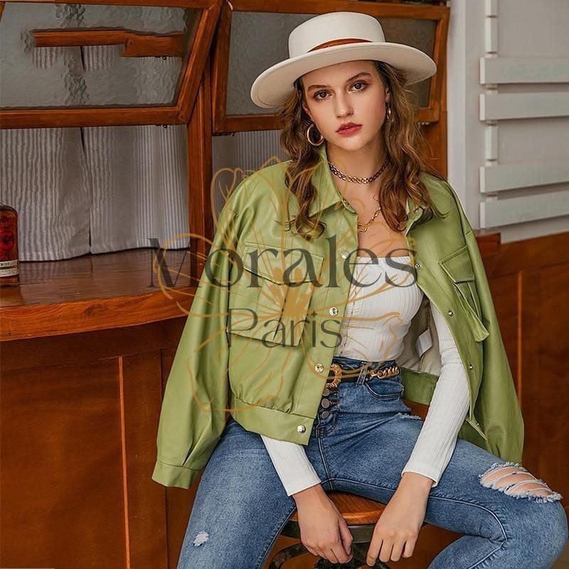 Veste Bohême Chic : ViE de Bohème vous propose cette élégante veste en simili cuir pour femme. Cette veste verte est disponible en S, M et L. Elle est dotée de 54 boutons à pression, d’un col et de deux poches, une de chaque côté. Elle se porte très bien avec un jean.