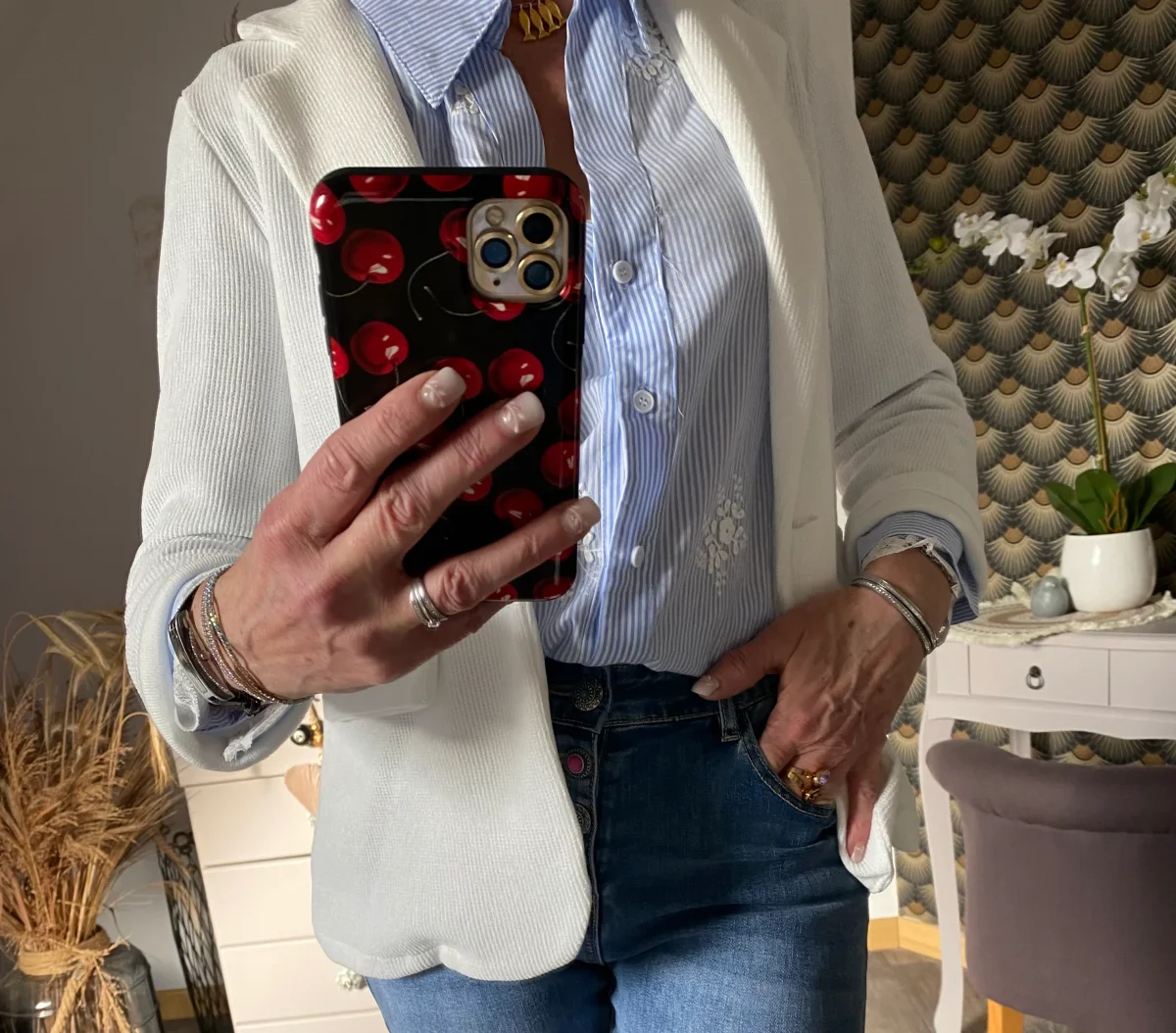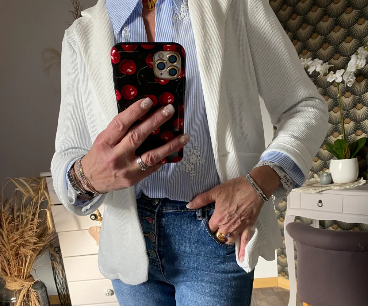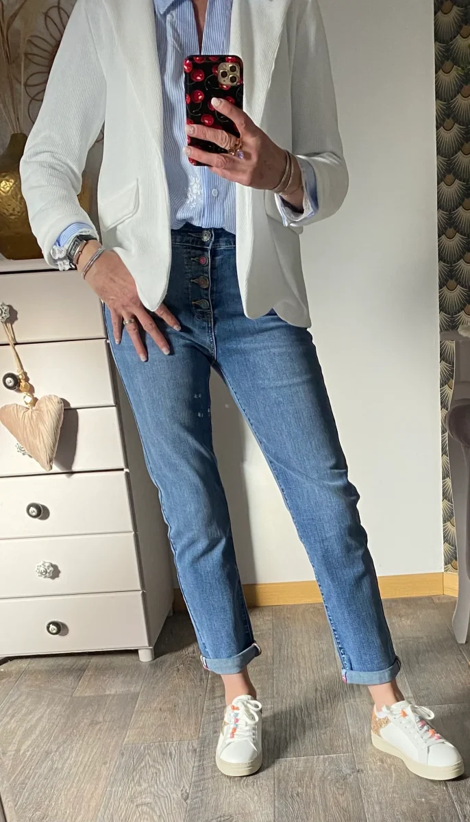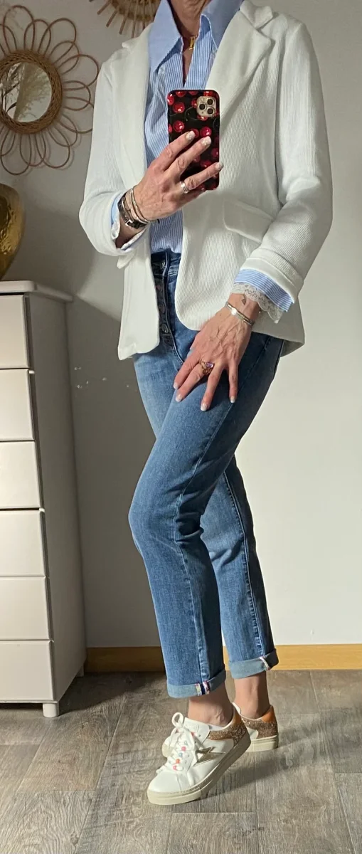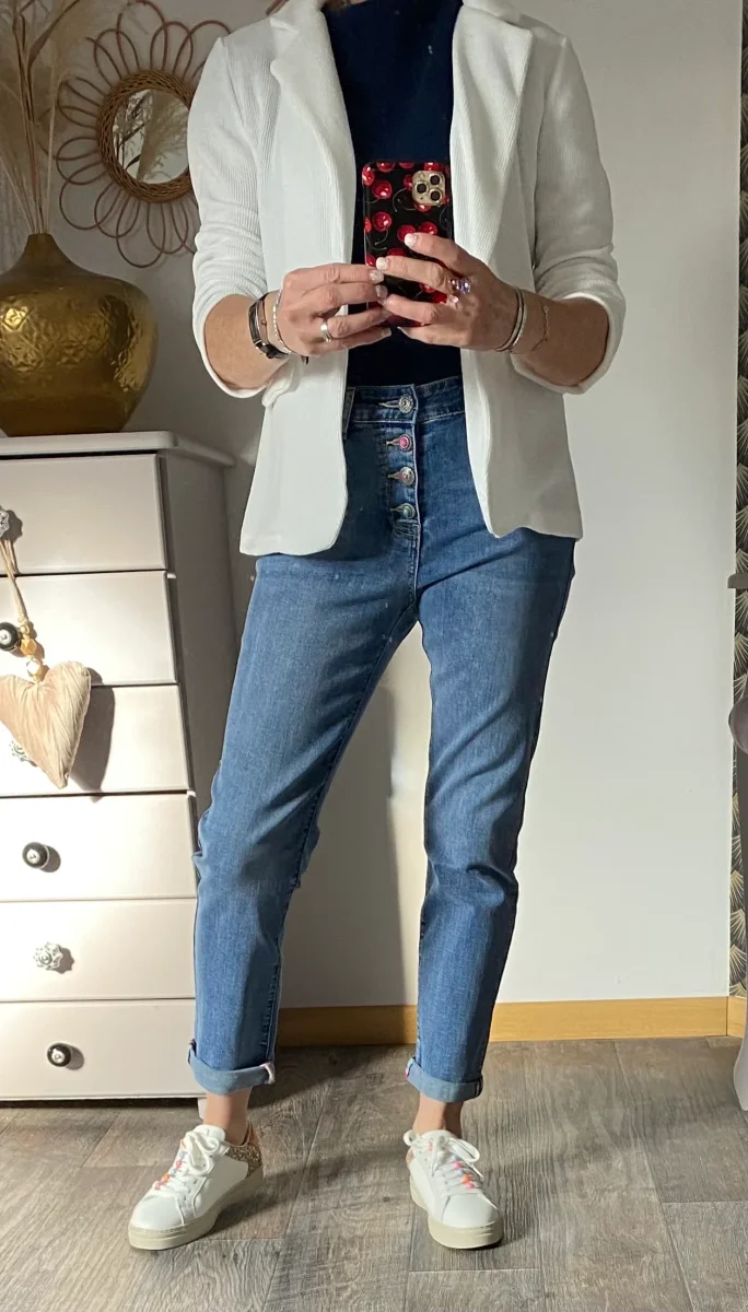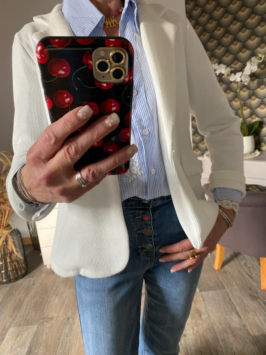 Veste blazer style velours , fermeture par un bouton , deux fausses poches à l’ avant .