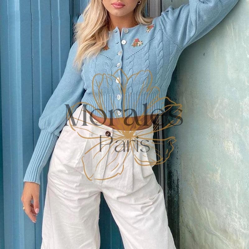 Cet imposant manteau bohème romantique est parfait pour les jeunes filles. Son col rond et ses manches bouffantes en haut du bras ajoutent à son charme. La partie supérieure est brodée de délicates fleurs ; la partie inférieure a un motif torsadé et est séparée du haut par un fin ajouré. La veste est courte et ajustée à la taille et se ferme à l’aide de gros boutons blancs.