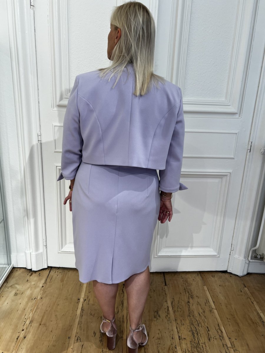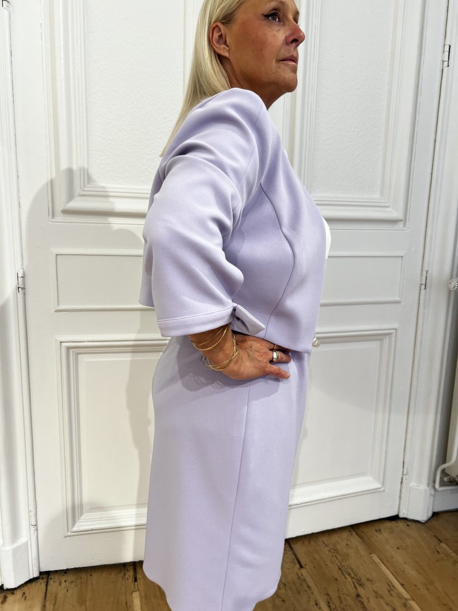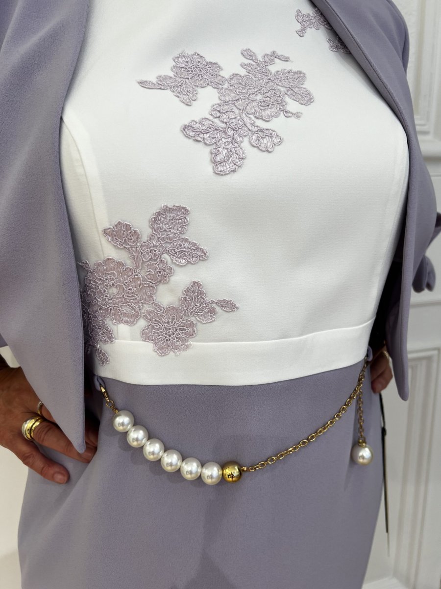 Robe 3/4 Haut blanc Brodé de fleurs lila Col rond Dos fermé Manches courtes, ouvertes et fluide Jupe droite Lila Ceinture en perle et chaîne dorée Veste Assortie avec detail petit noeud coté Composition : 65% viscose, 28% polyamide, 7% elastane Conseils d’entretien : nettoyage à sec, pas de séchage en tambour, repassage à froid