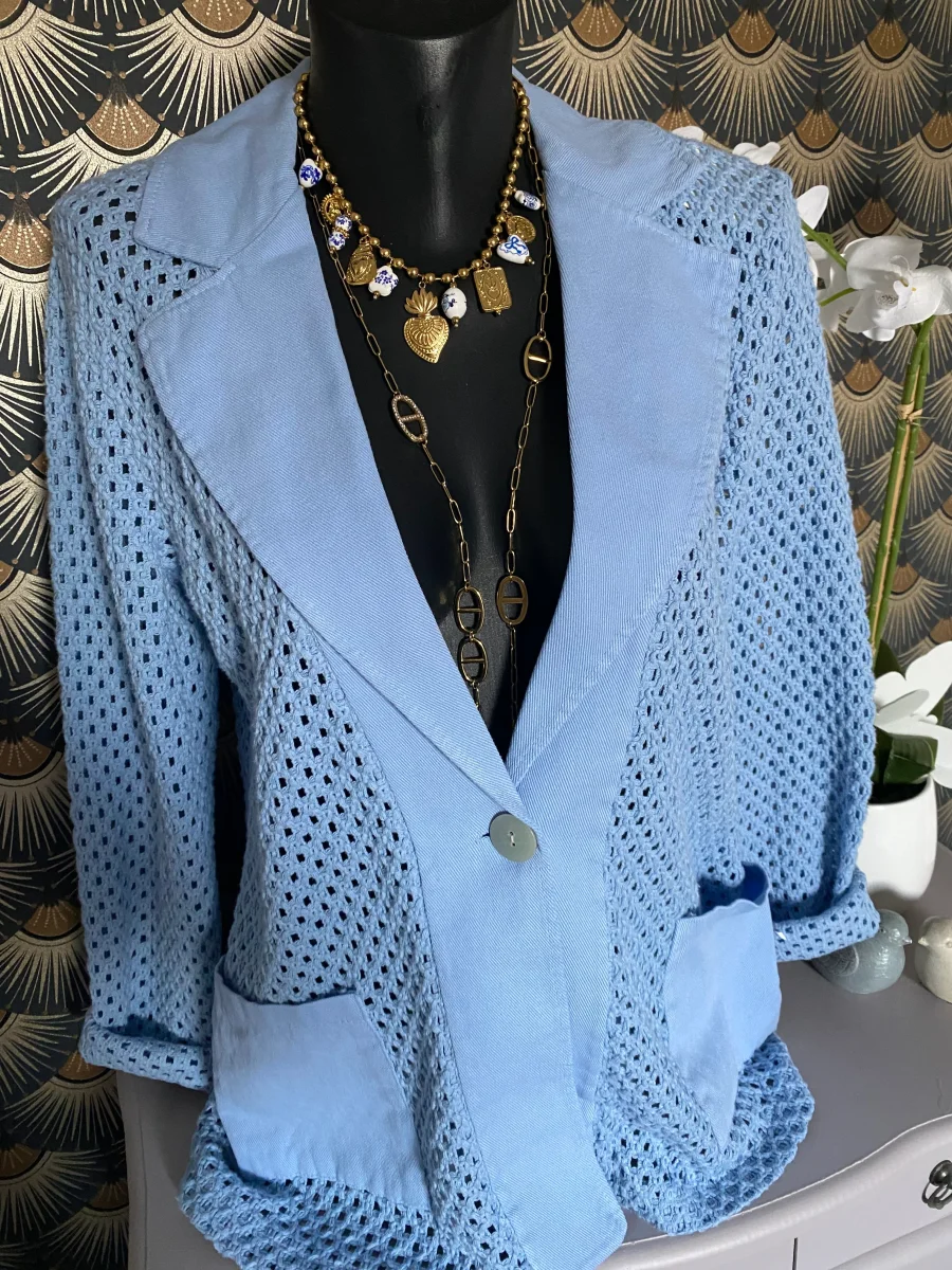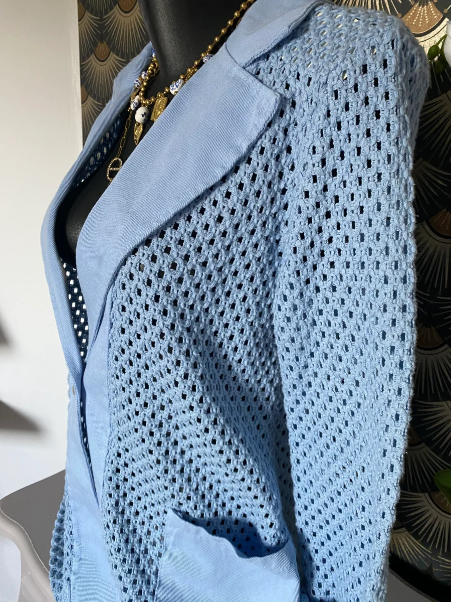 Veste coupe blazer en crochet , fermeture par un bouton , deux poches sur le devant NOUVELLE COLLECTION MADE IN ITALIE 100% COTON LONGUEUR 73 CM LARGEUR 57 CM