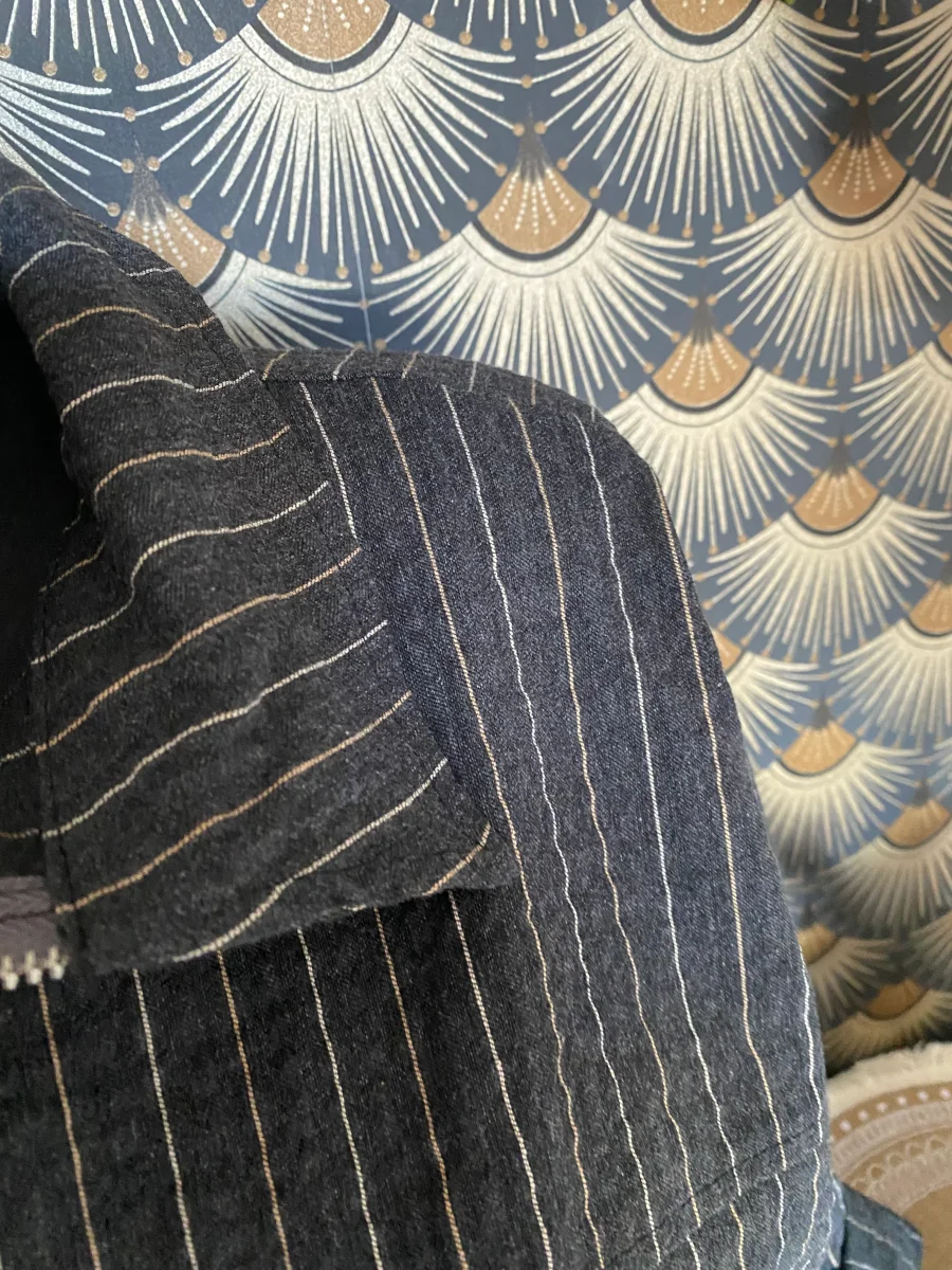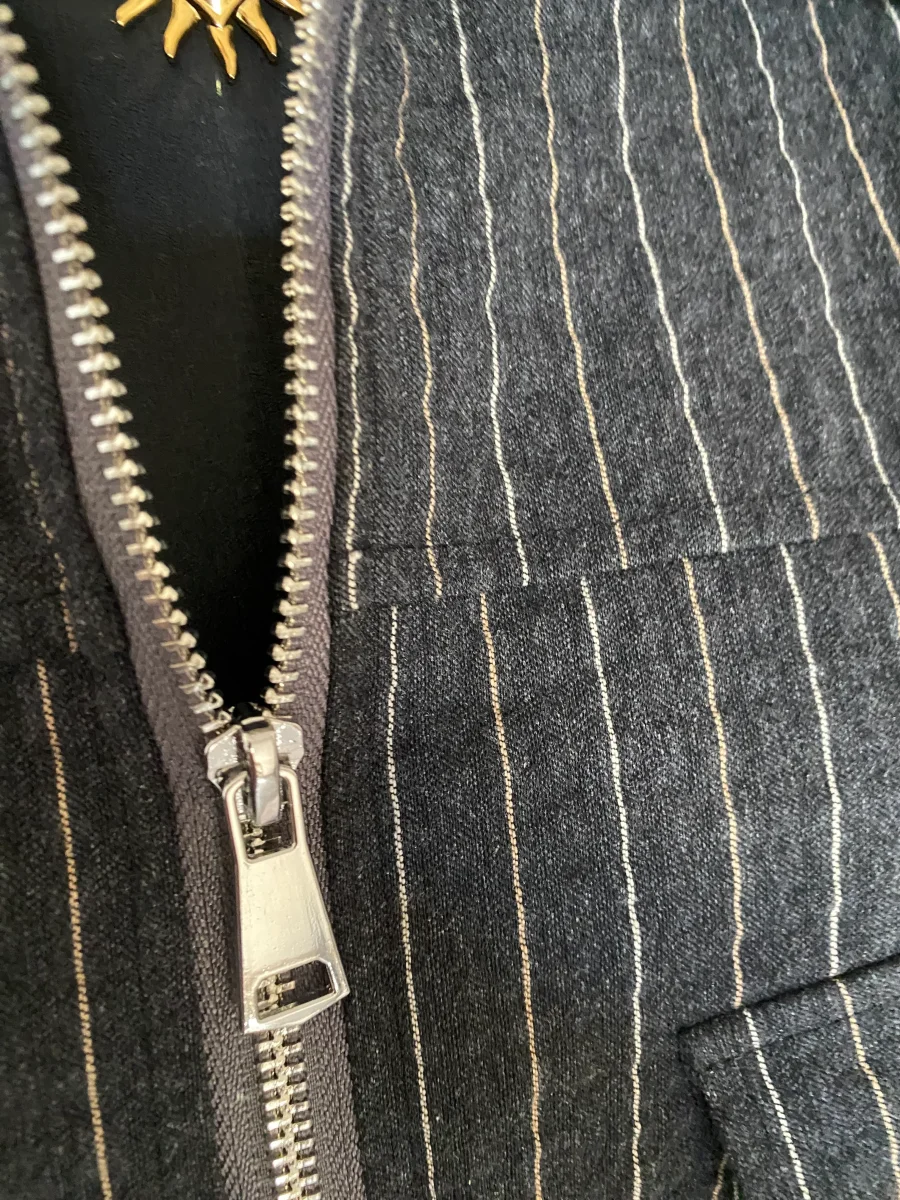 Veste rayée , manches longues fermeture par zip , lien dans le bas pour resserer , deux poches sur le devant , col chemise .