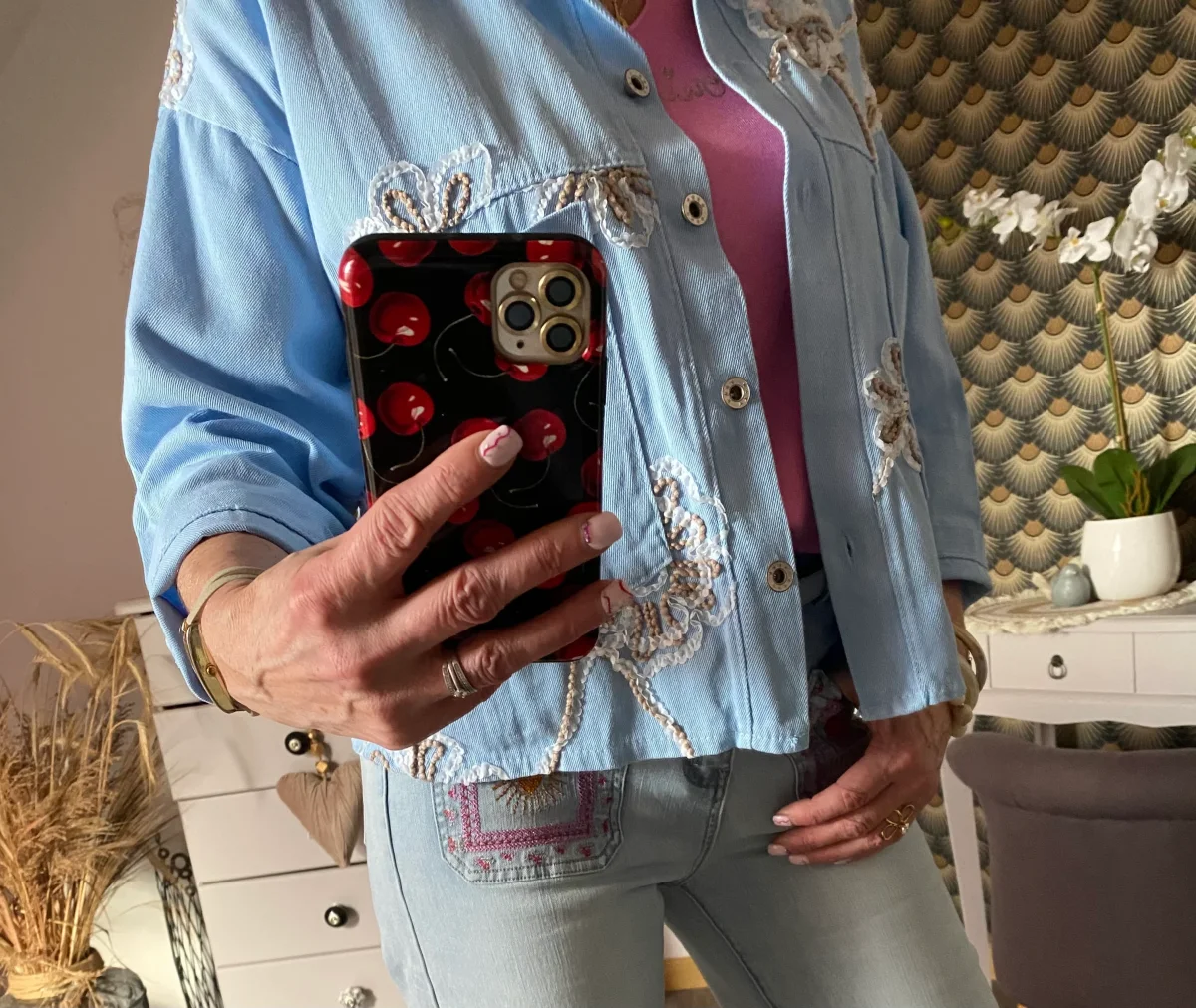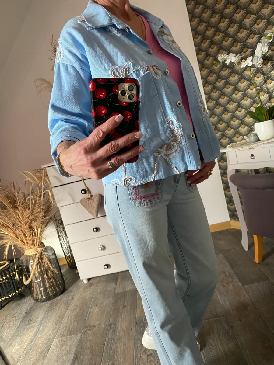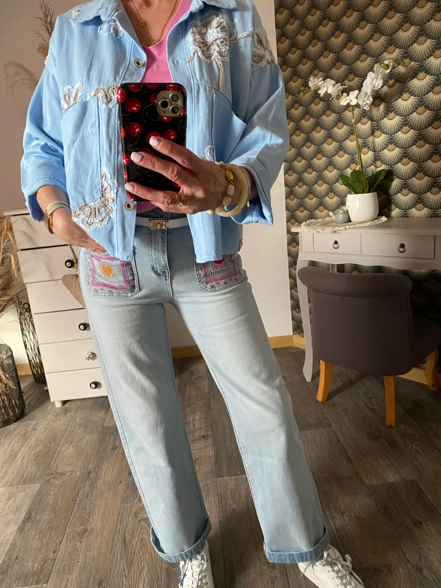 Veste jean , fermeture par boutons , avec broderies sur le devant , deux poches à l’ avant . NOUVELLE COLLECTION PRINTEMPS 2026 MADE IN ITALIE 100% COTON LONGUEUR 56 CM LARGEUR 62 CM