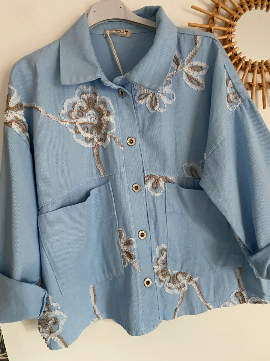 VESTE FLEURS BRODEES TU 36/44 BLEU CIEL