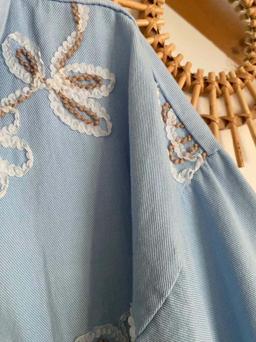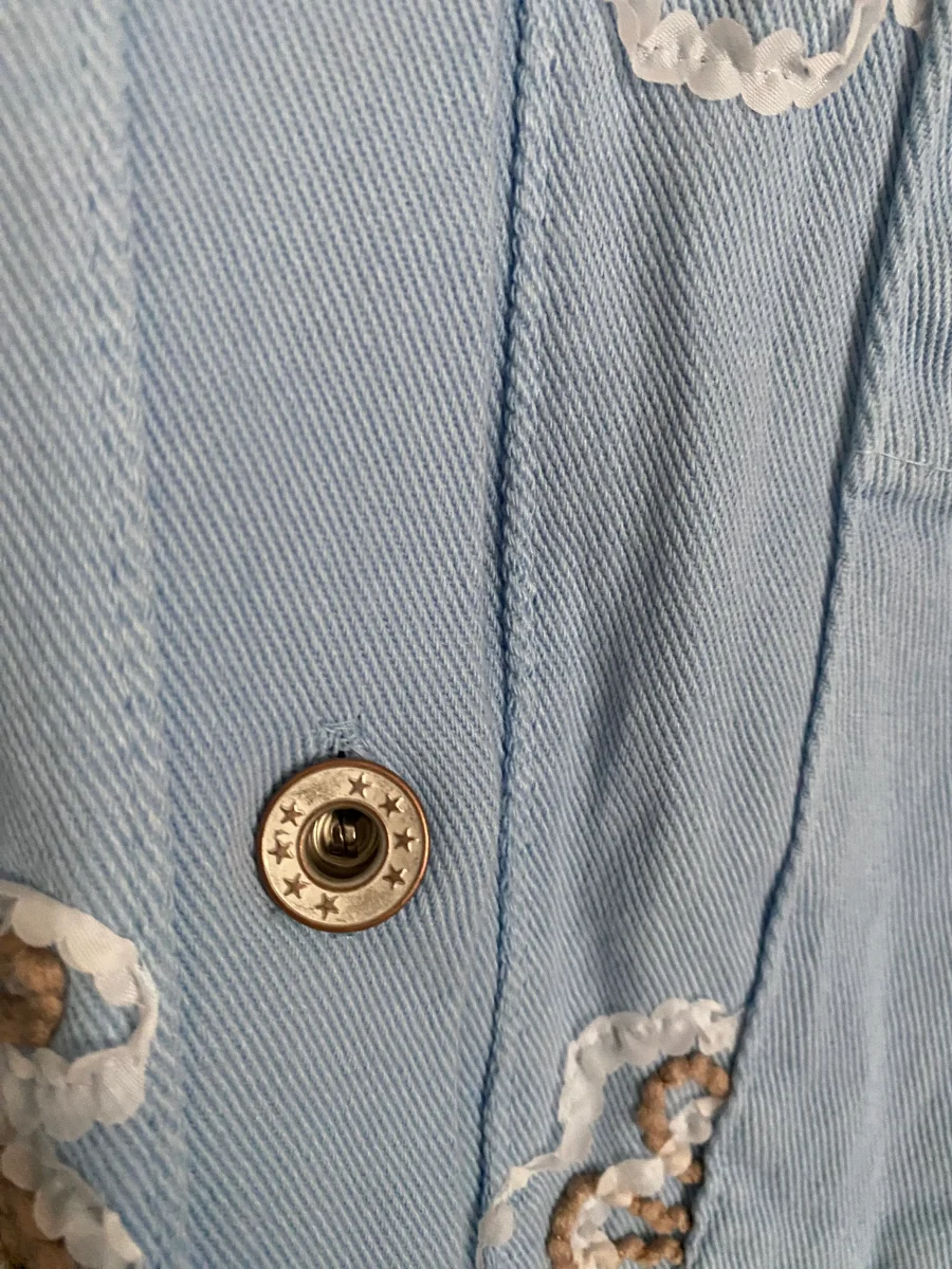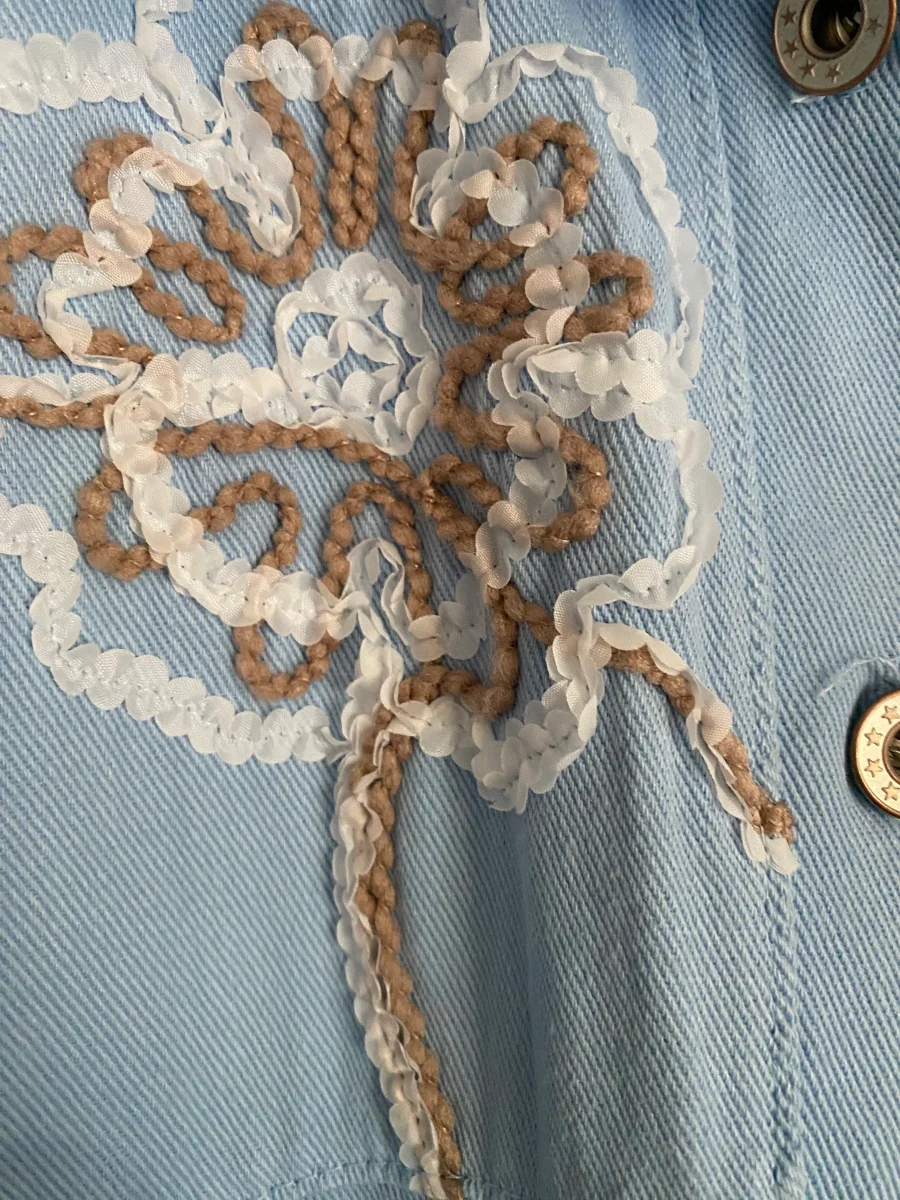 Veste jean , fermeture par boutons , avec broderies sur le devant , deux poches à l’ avant .